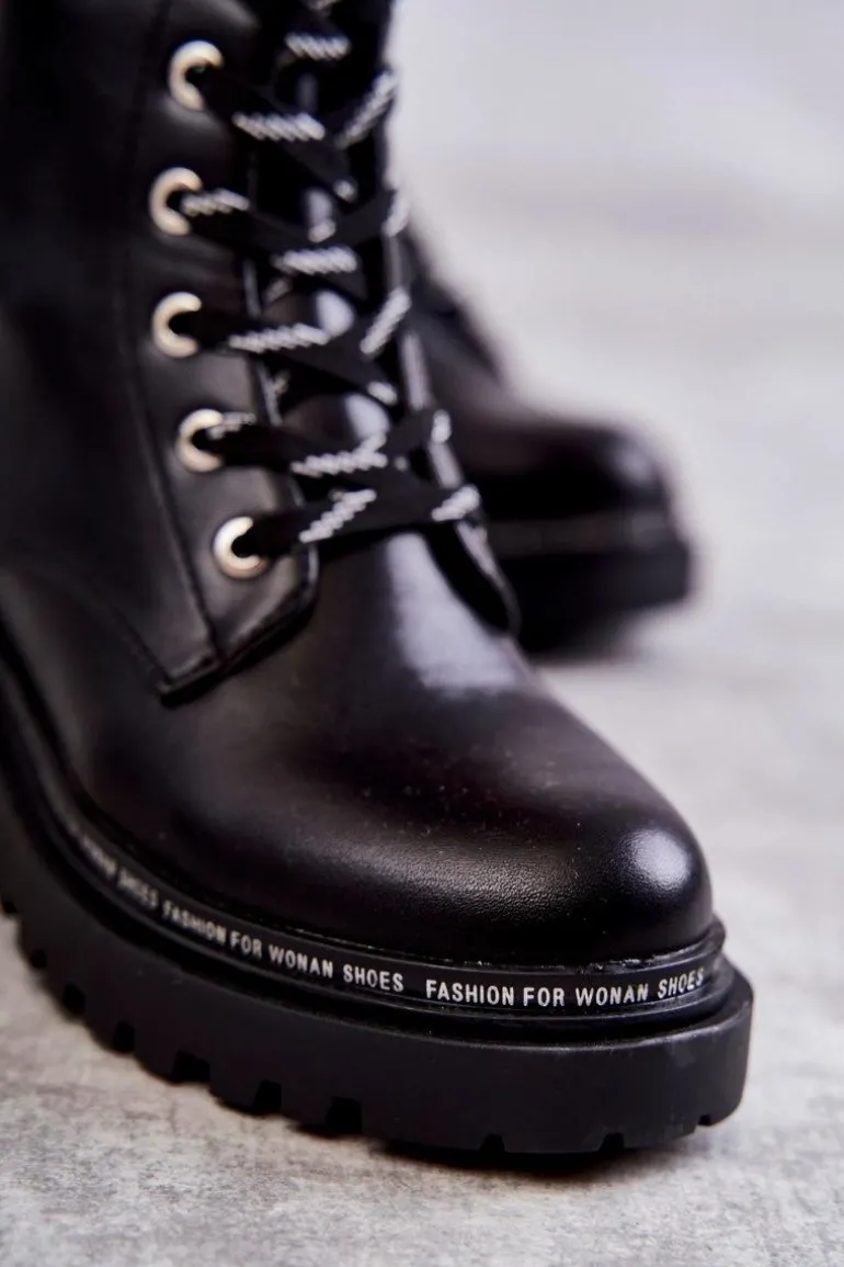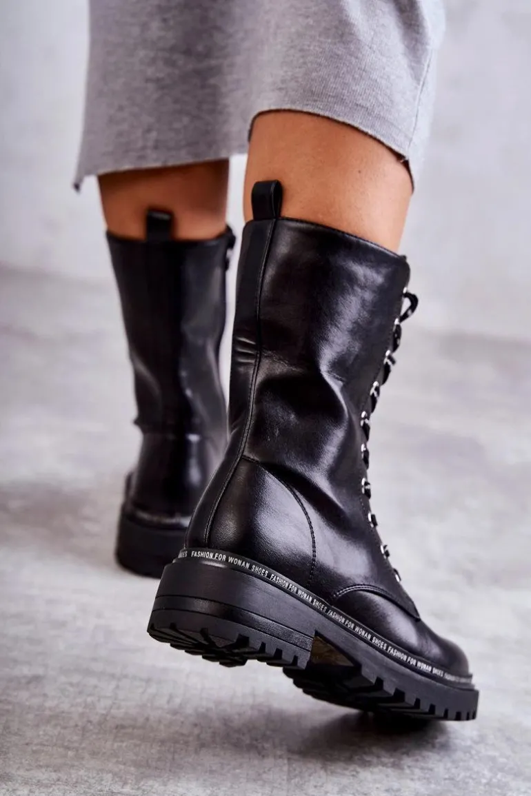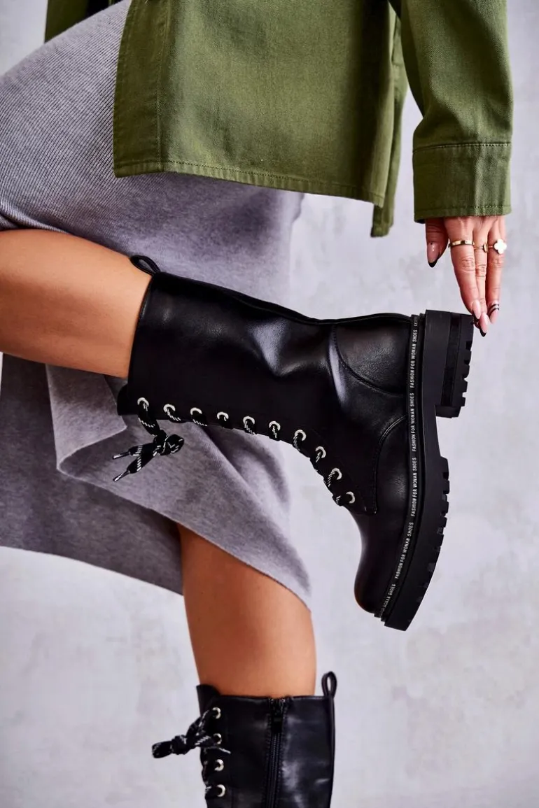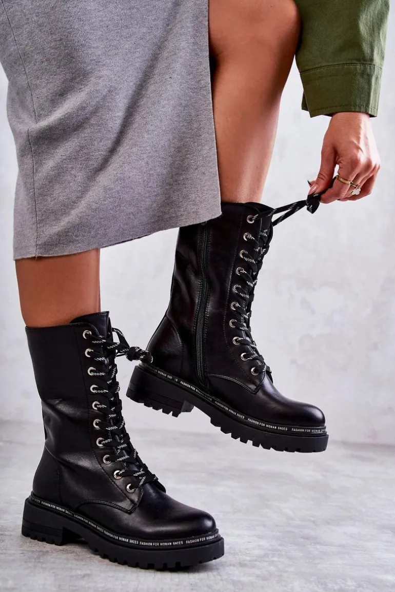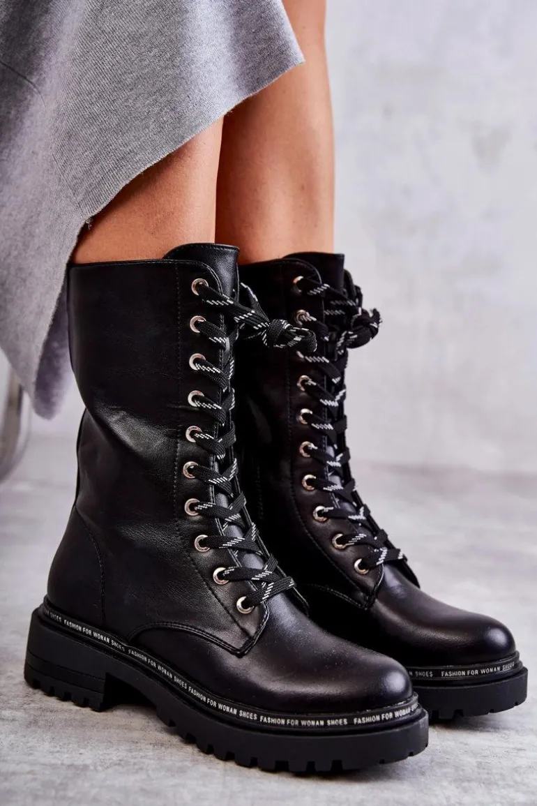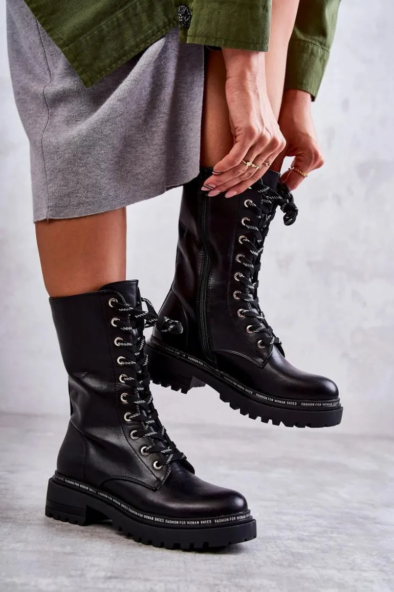 Botki z wysoką cholewką zostały wykonane z eko skóry. Model z usztywnianym zapiętkiem. Botki te posiadają suwak ułatwiający zakładanie obuwia oraz wiązanie pozwalające na odpowiednie dopasowanie obuwia do tęgości nogi. Osadzone na platformie i płaskim obcasie. Posiadają ocieplenie w postaci koca obuwniczego. Świetny model do wielu stylizacji! Przy wyborze rozmiaru prosimy sugerować się tabelą rozmiarów.