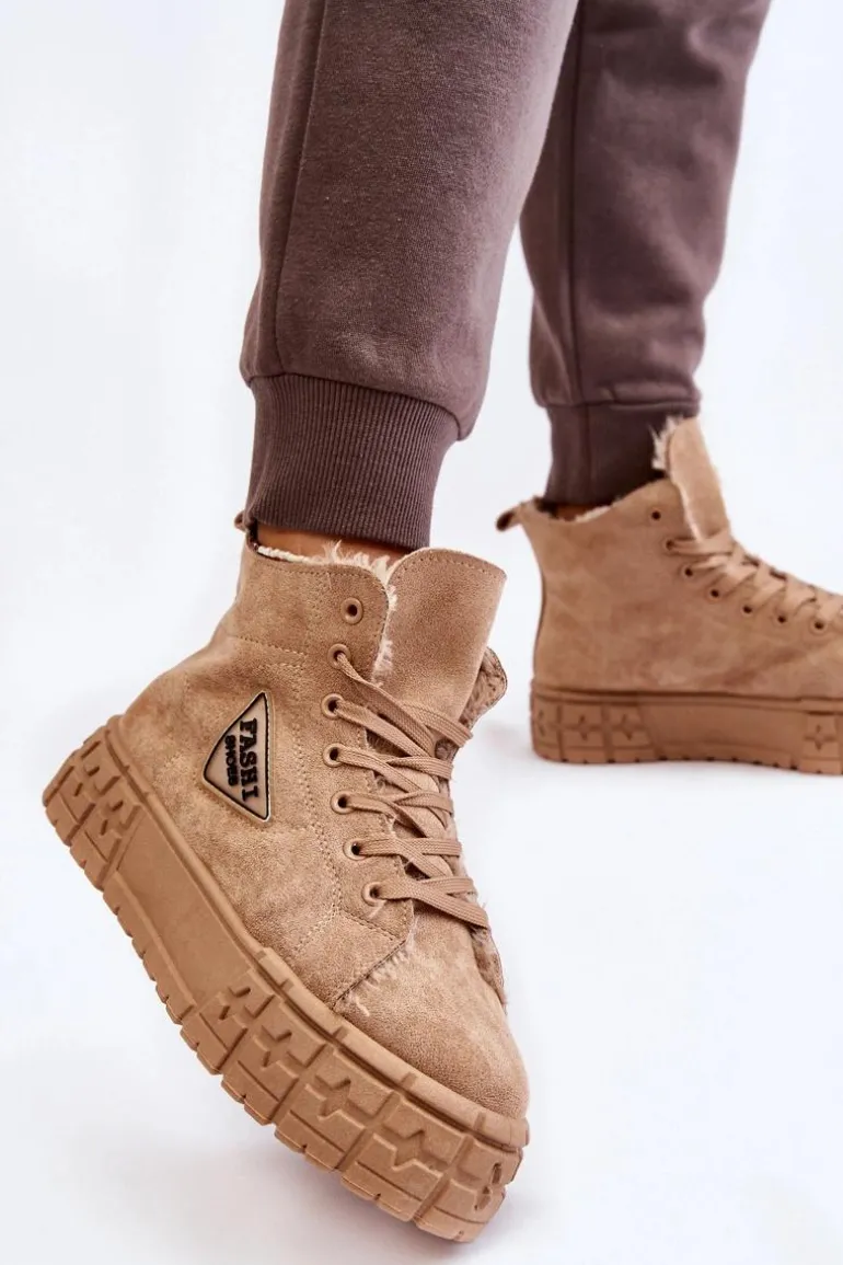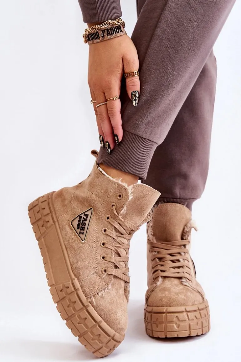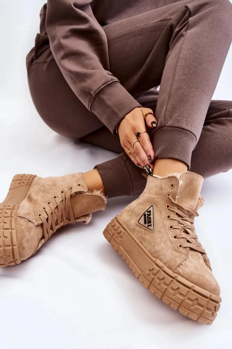 Modne trampki z cholewką wykonaną z eko zamszu. Posiadają wewnątrz ocieplenie w postaci futerka. Model klasycznie sznurowany. Trampki zostały osadzone na masywnej platformie, która delikatnie uniesie sylwetkę. Model ten świetnie sprawdzi się w chłodniejsze dni. Koniecznie powinnaś je mieć! Przy wyborze rozmiaru prosimy sugerować się tabelą rozmiarów.