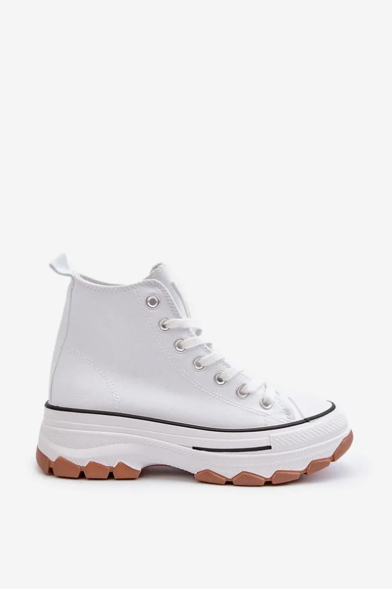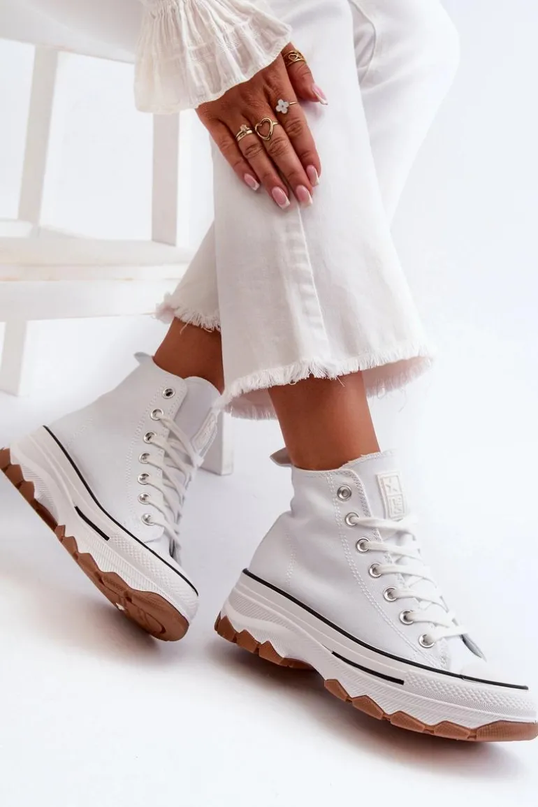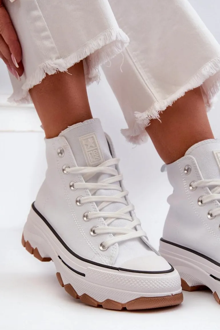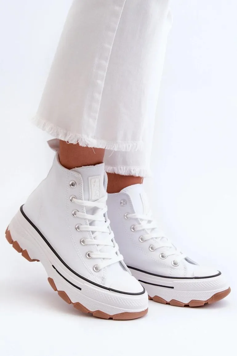 Wysokie trampki damskie na platformie to doskonały wybór dla modnych kobiet. Podwyższona podeszwa dodaje nie tylko centymetrów, ale także oryginalnego wyglądu każdej stylizacji. Wykonane z materiału tekstylnego. Model ten to must-have dla każdej kobiety, która chce połączyć komfort z modnym wyglądem. Przy wyborze rozmiaru prosimy sugerować się tabelą rozmiarów.