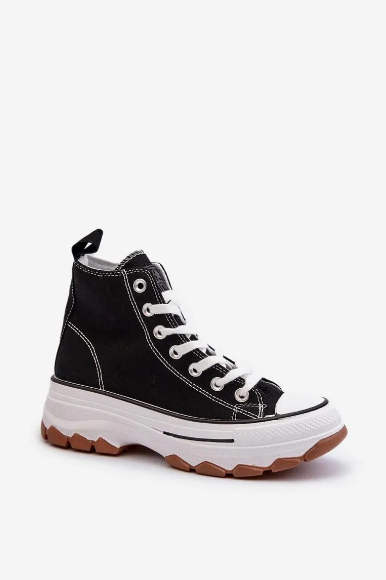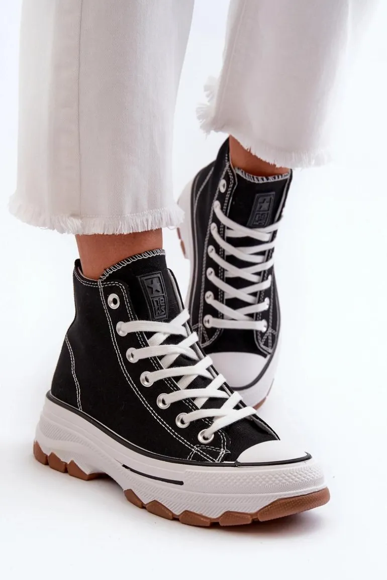 Wysokie trampki damskie na platformie to doskonały wybór dla modnych kobiet. Podwyższona podeszwa dodaje nie tylko centymetrów, ale także oryginalnego wyglądu każdej stylizacji. Wykonane z materiału tekstylnego. Model ten to must-have dla każdej kobiety, która chce połączyć komfort z modnym wyglądem. Przy wyborze rozmiaru prosimy sugerować się tabelą rozmiarów.