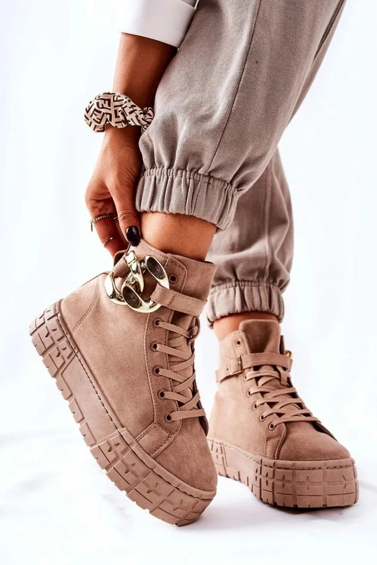 Buty zostały wykonane z zamszowej eko skóry. Wysokie trampki posiadają ozdobny łańcuch na pasku, który jest zapinany na sprzączkę. Można go także całkowicie zdjąć. Buty posiadają wysoką, stabilną platformę. Wśrodku znajduje się materiałowa wkładka. Koniecznie sprawdź także pozostałą naszą ofertę trampek na platformie! Przy wyborze rozmiaru prosimy sugerować się tabelą rozmiarów.