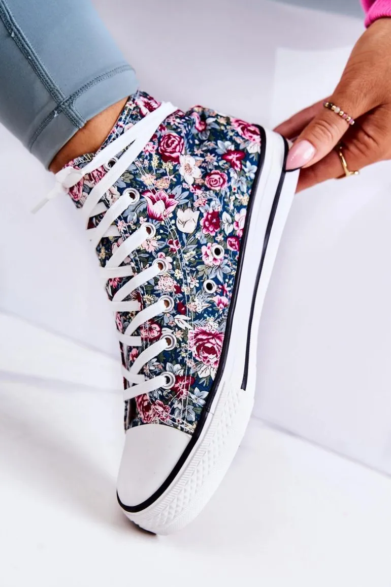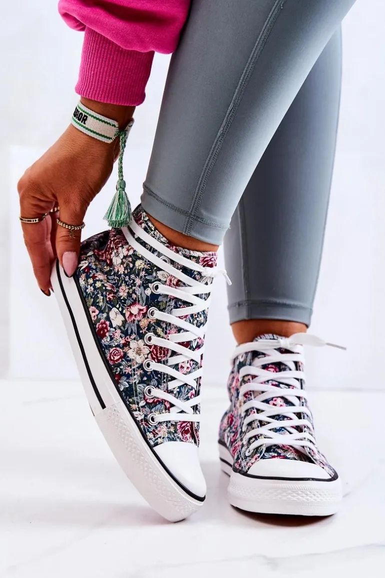 Wysokie trampki w klasycznej formie i modnym wzorze. Kultowe trampki pasują do wielu stylizacji. Buty dobrze dopasowują się do kształtu stopy, posiadają miękką, materiałową wkładkę oraz antypoślizgową podeszwę. Model wiązany z wyższą cholewką. Nosek gumowy. Koniecznie sprawdź całą naszą kolekcję damskich trampek. Przy wyborze rozmiaru prosimy sugerować się tabelą rozmiarów.