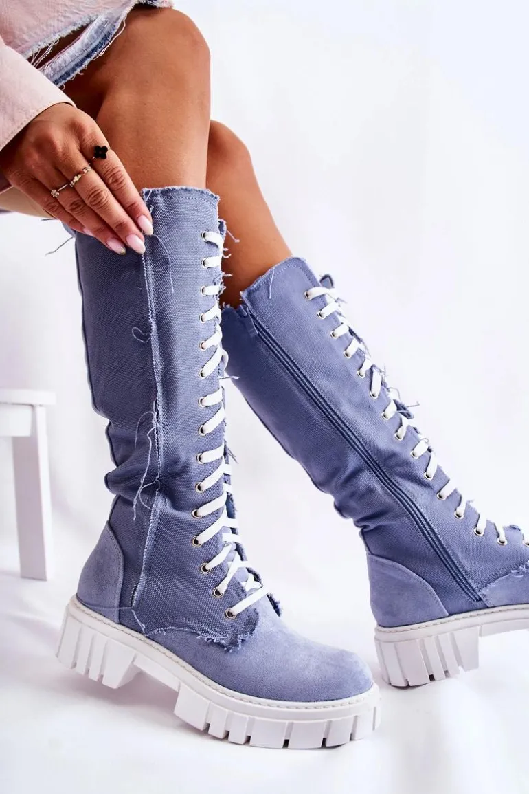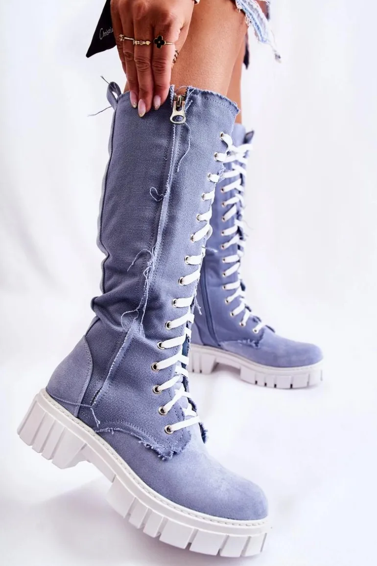 Wspaniałe kozaki w formie traperów. Wysoka cholewka została wykonana z połączenia materiału oraz eko zamszu. Zakładanie ułatwi wszyty na boku suwak, a idealne dopasowanie zapewni solidne sznurowanie na całej długości cholewki. Gruba podeszwa to dodatkowa ochrona przed zimnym podłożem. Wkładka wykonana z eko skóry. Zapiętek usztywniany. Przy wyborze rozmiaru prosimy sugerować się tabelą rozmiarów.