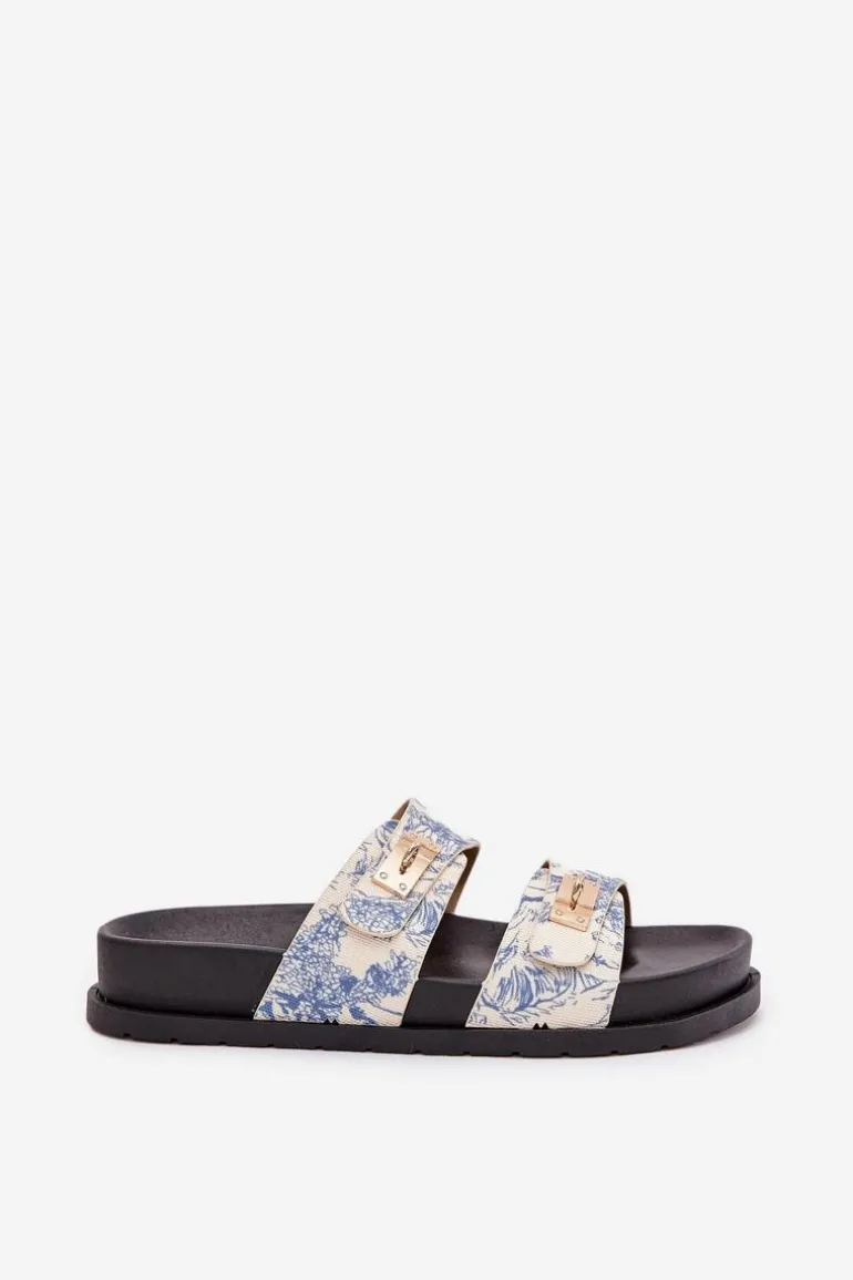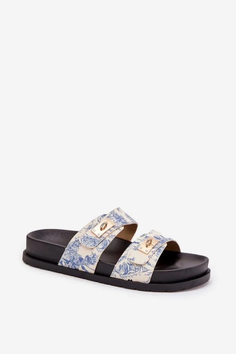 Wzorzyste klapki damskie wykonane z materiału tekstylnego, osadzone na platformie, to stylowa propozycja na letnie dni. Model wyróżnia się dwoma paskami ozdobionymi złotymi elementami, które dodają im wyjątkowego charakteru. Idealne do codziennych stylizacji, świetnie komponują się z sukienkami, spódnicami czy szortami, zapewniając modny wygląd. Przy wyborze rozmiaru prosimy sugerować się tabelą rozmiarów.
