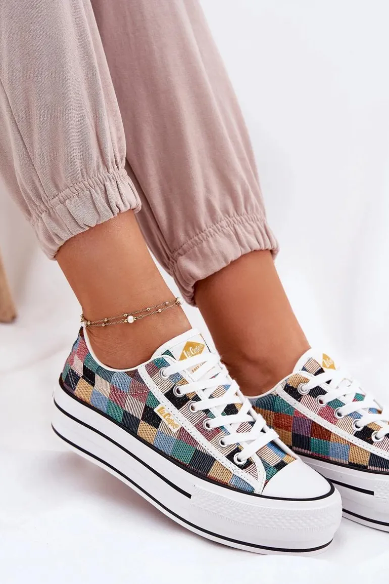 Damskie trampki od Lee Cooper, wykonane z materiału tekstylnego, stanowią idealne połączenie komfortu i stylowego wyglądu. Osadzone na platformie, która delikatnie podnosi sylwetkę. Klasyczne sznurowanie umożliwia doskonałe dopasowanie do stopy, a miękka materiałowa wkładka zapewnia odpowiednią amortyzację. Te trampki to znakomity wybór do codziennych stylizacji! Przy wyborze rozmiaru prosimy sugerować się poniższą tabelą rozmiarów.