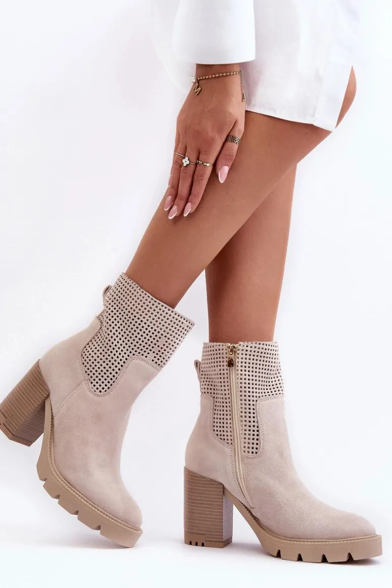 Modne, ażurowe botki na obcasie w postaci słupka zostały wykonane z wysokiej jakości skóry naturalnej. Zapinane na suwak z boku cholewki. Miękka, niezwykle wygodna wkładka została wykonana również z naturalnej skóry. Świetny model do wielu stylizacji! Przy wyborze rozmiaru prosimy sugerować się tabelą rozmiarów.