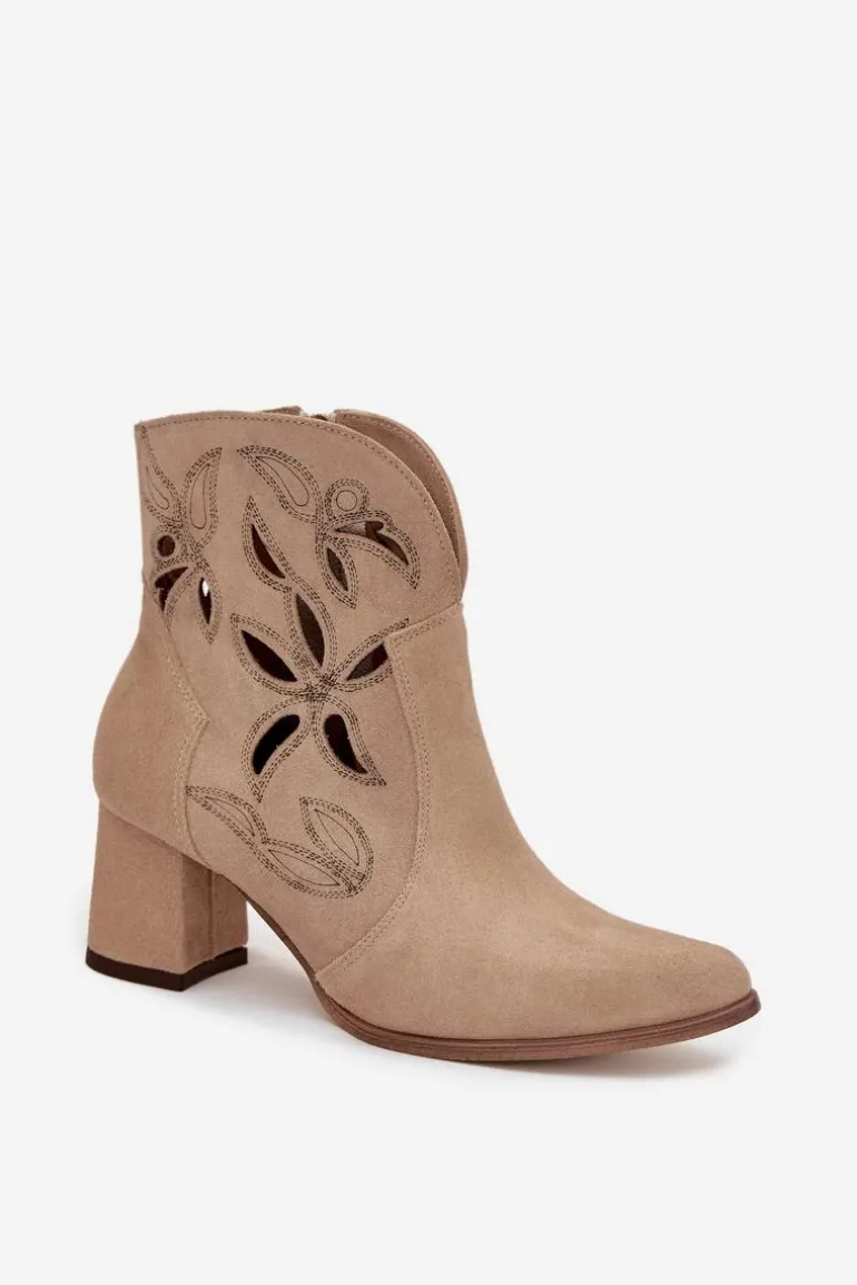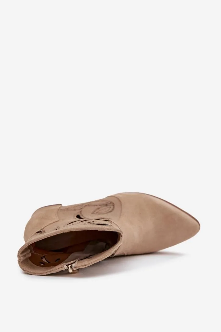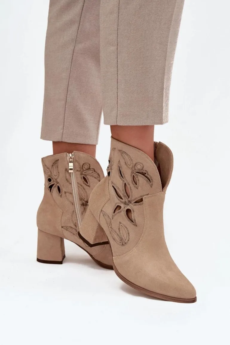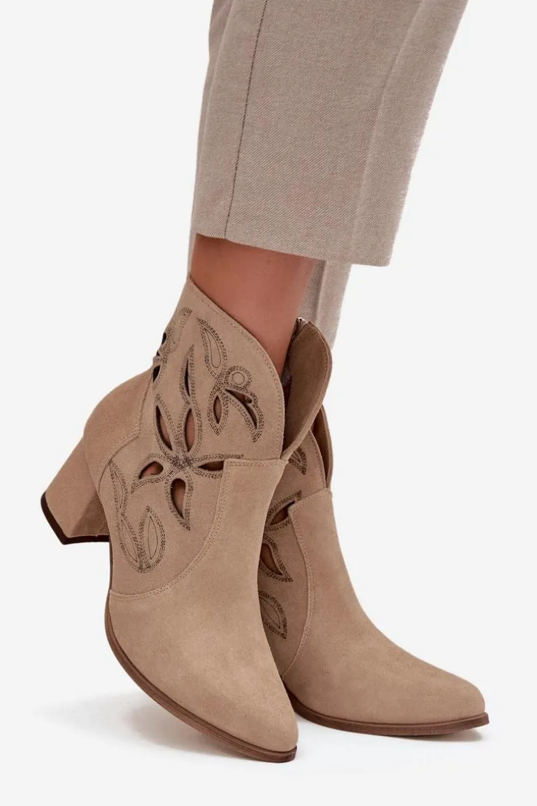 Botki damskie wykonane z naturalnego zamszu. Ażurowy wzór dodaje im oryginalności i lekkości, podkreślając wyjątkowy charakter tego modelu. Obcas typu słupek zapewnia stabilność i wygodę, a jednocześnie pięknie wydłuża sylwetkę. Szpiczaste noski wprowadzają elegancki akcent, sprawiając, że buty prezentują się niezwykle zgrabnie. Dzięki zapięciu na zamek są łatwe w zakładaniu i zdejmowaniu, co zwiększa komfort codziennego użytkowania. To obuwie idealne na sezon przejściowy, które świetnie uzupełni zarówno casualowe, jak i bardziej eleganckie zestawy. Przy wyborze rozmiaru prosimy sugerować się tabelą rozmiarów.
