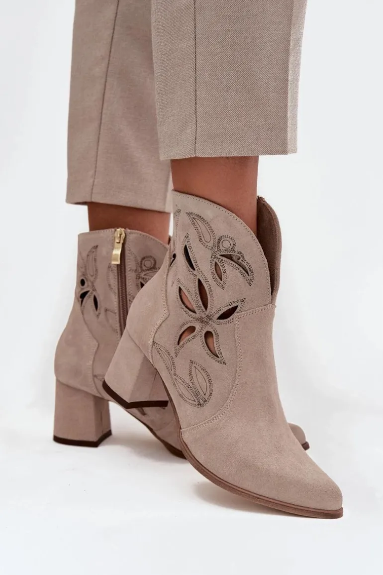Botki damskie wykonane z naturalnego zamszu. Ażurowy wzór dodaje im oryginalności i lekkości, podkreślając wyjątkowy charakter tego modelu. Obcas typu słupek zapewnia stabilność i wygodę, a jednocześnie pięknie wydłuża sylwetkę. Szpiczaste noski wprowadzają elegancki akcent, sprawiając, że buty prezentują się niezwykle zgrabnie. Dzięki zapięciu na zamek są łatwe w zakładaniu i zdejmowaniu, co zwiększa komfort codziennego użytkowania. To obuwie idealne na sezon przejściowy, które świetnie uzupełni zarówno casualowe, jak i bardziej eleganckie zestawy. Przy wyborze rozmiaru prosimy sugerować się tabelą rozmiarów.