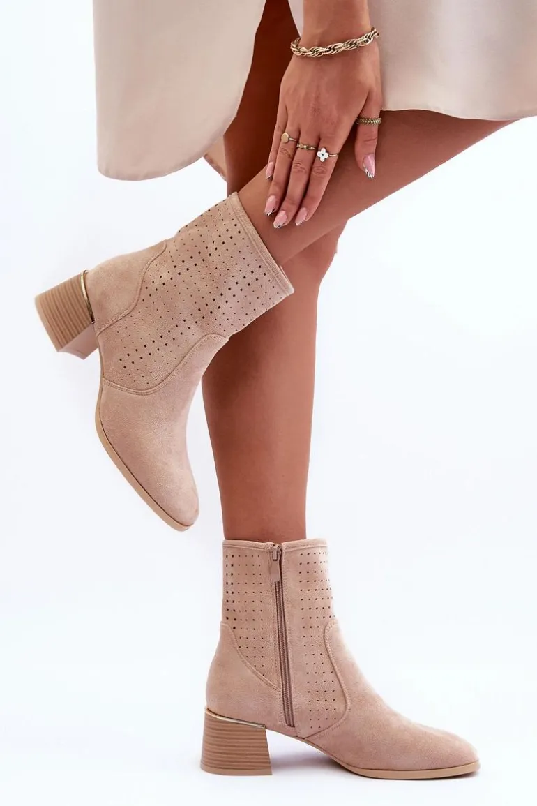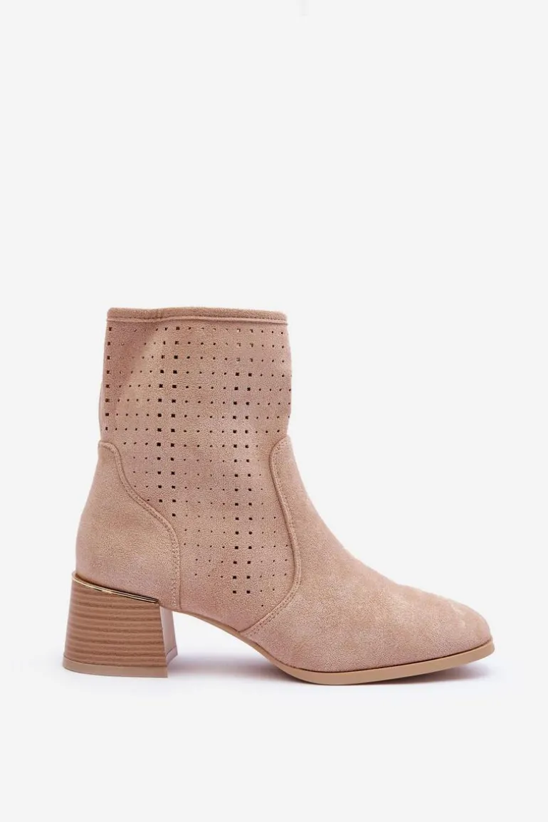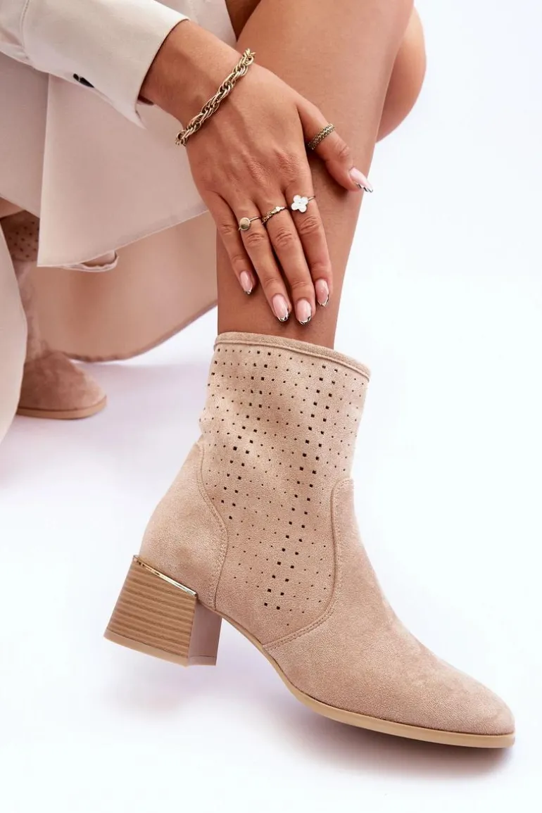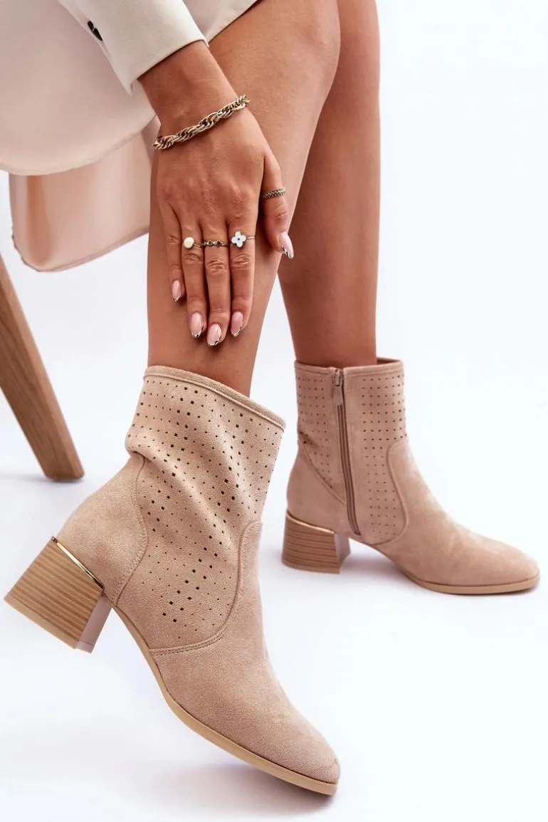 Zamszowe Ażurowe Botki Na Obcasie Beżowe Perale