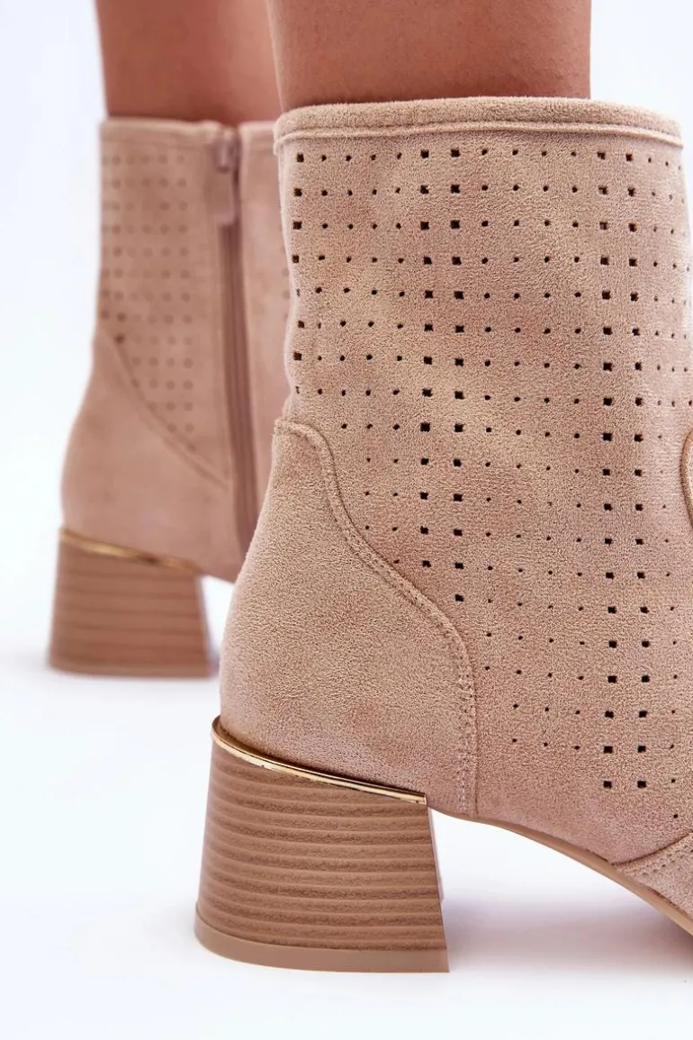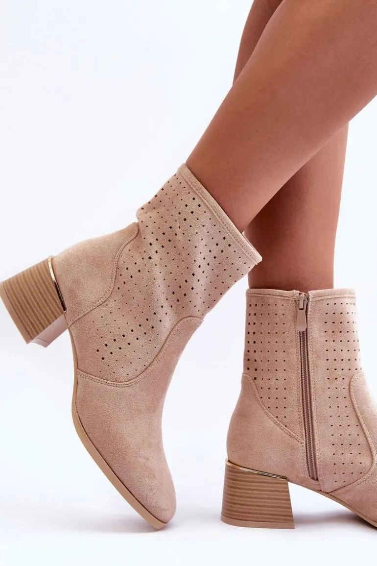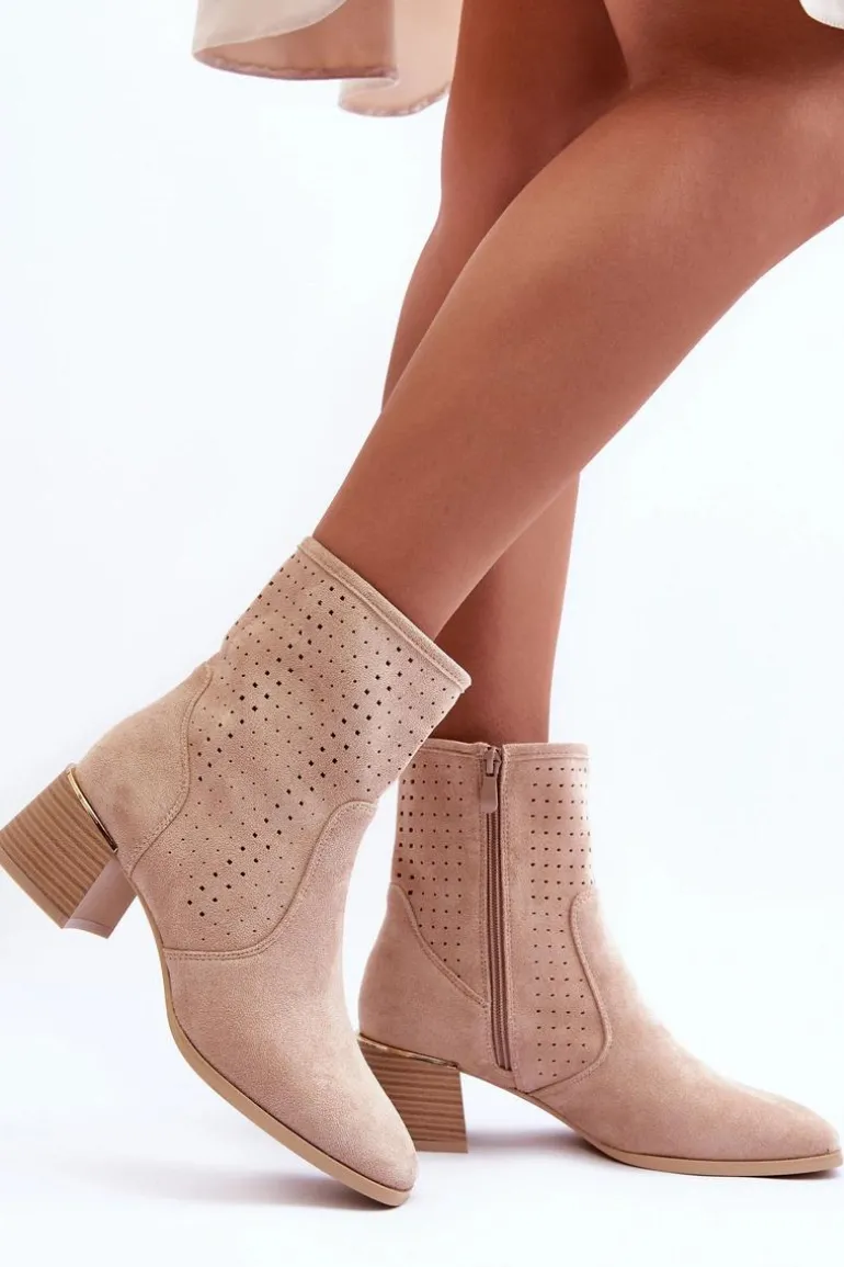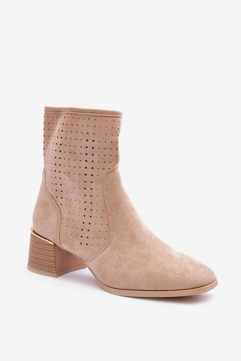 Zamszowe Ażurowe Botki Na Obcasie Beżowe Perale