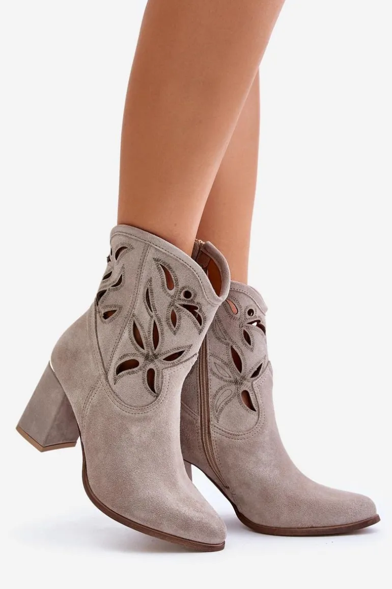Modne, ażurowe botki na obcasie w postaci słupka. Wykonane z wysokiej jakości naturalnego zamszu. Głównym atutem tego modelu jest ażurowy wzór na cholewce. Zapinane na zamek błyskawiczny. Noski w szpic optycznie wysmuklą nogi. Miękka, niezwykle wygodna wkładka została wykonana z naturalnej skóry. Świetny model do wielu stylizacji! Przy wyborze rozmiaru prosimy sugerować się tabelą rozmiarów.