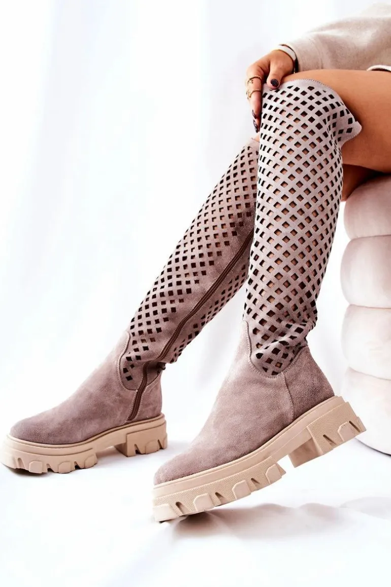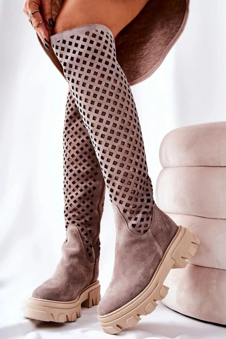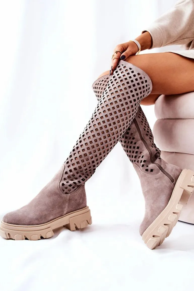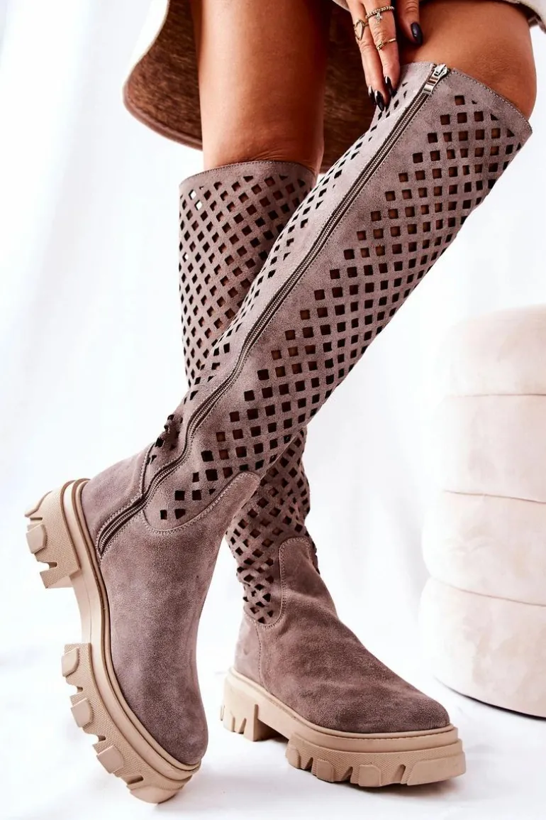 Kozaki wykonane są z naturalnej zamszowej skóry wysokiej jakości. Na długości cholewki posiadają ażurowy wzór. Workerowa podeszwa jest masywna i stabilna. Na długości całej cholewki znajduje się suwak ułatwiający zakładanie obuwia. Świetnie będą prezentować się w wielu stylizacjach. Przy wyborze rozmiaru prosimy sugerować się tabelą rozmiarów.