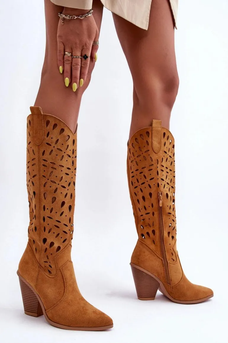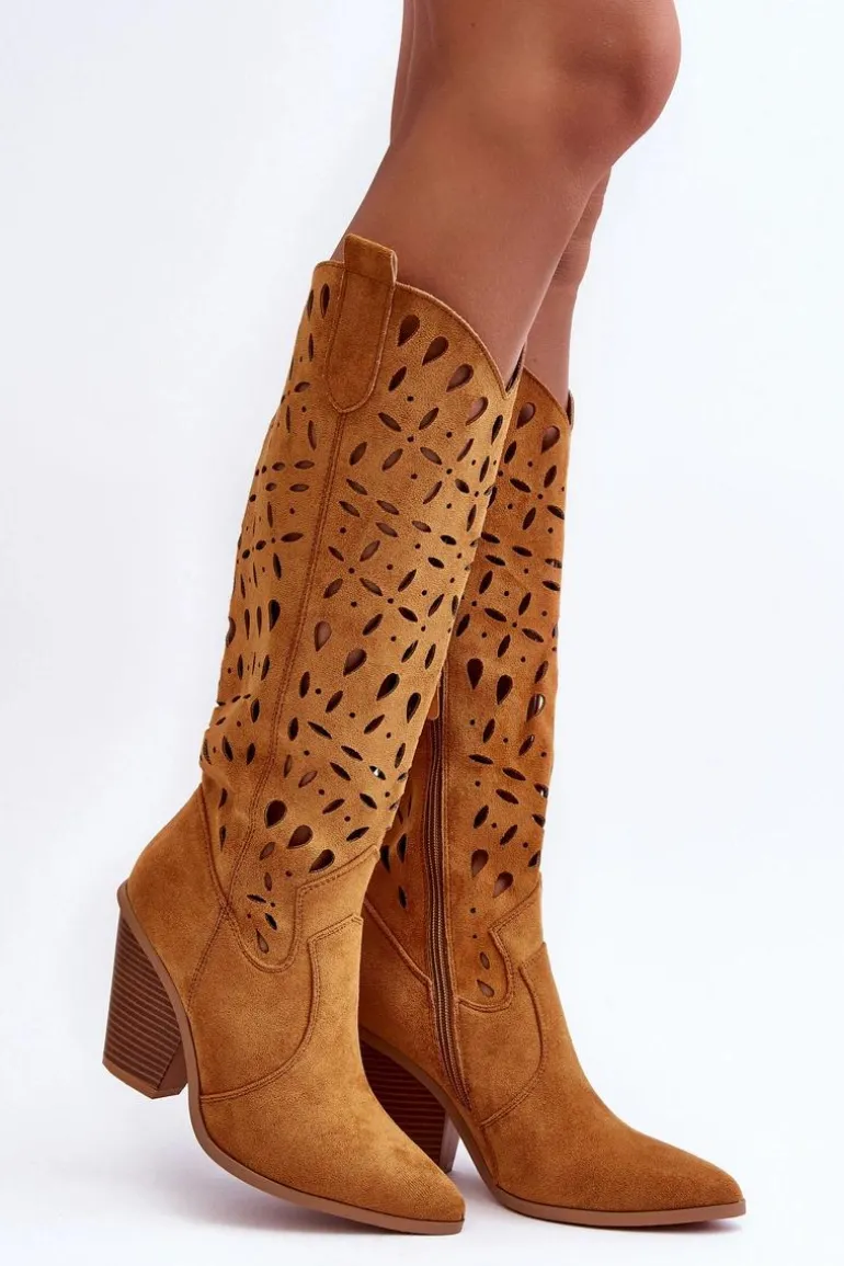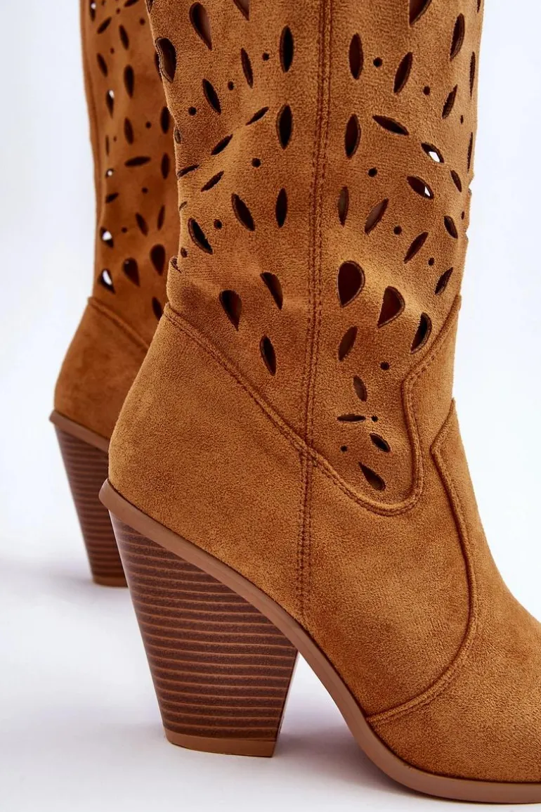 Damskie, modne kozaki zostały wykonane z eko zamszu. Ozdobione ażurowym wzorem oraz tłoczeniem. Buty te posiadają obcas w postaci niskiego słupka oraz usztywniony zapiętek. Model wsuwany i dodatkowo wzbogacony zapięciem na suwak. Przy wyborze rozmiaru prosimy sugerować się tabelą rozmiarów.
