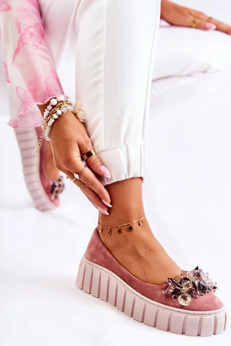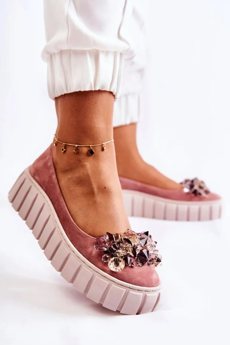 Damskie baleriny wykonane z naturalnego zamszu z dbałością o każdy detal. O komfort zadba miękka, skórzana wkładka. Podeszwa wykonana z gumowego tworzywa ze żłobieniami po bokach. Dodatkowo jest antypoślizgowa. Zapiętek jest usztywniany. Z przodu elegancka ozdoba w postaci imitacji kryształków doda tym butom uroku. Nosek zaokrąglony. Baleriny dopełnią wiele Twoich stylizacji. Przy wyborze rozmiaru prosimy sugerować się tabelą rozmiarów.