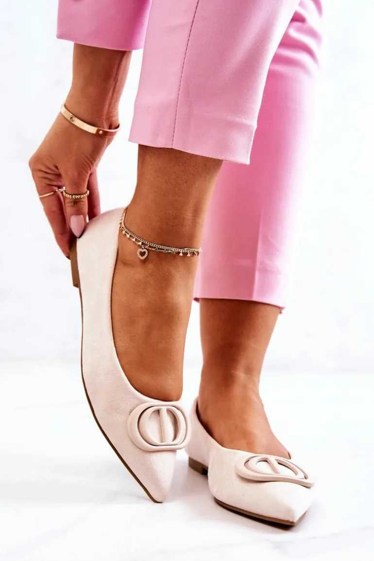 Eleganckie baleriny z ozdobnym elementem z tworzywa sztucznego. Buty wykonane są w całości z zamszowej eko skóry. Miękka wkładka zadba o Twój komfort. Nosek w szpic. Baleriny dopełnią wiele stylizacji i przydadzą się na wiele okazji. Koniecznie sprawdź całą naszą kolekcję balerinek. Przy wyborze rozmiaru prosimy sugerować się tabelą rozmiarów.