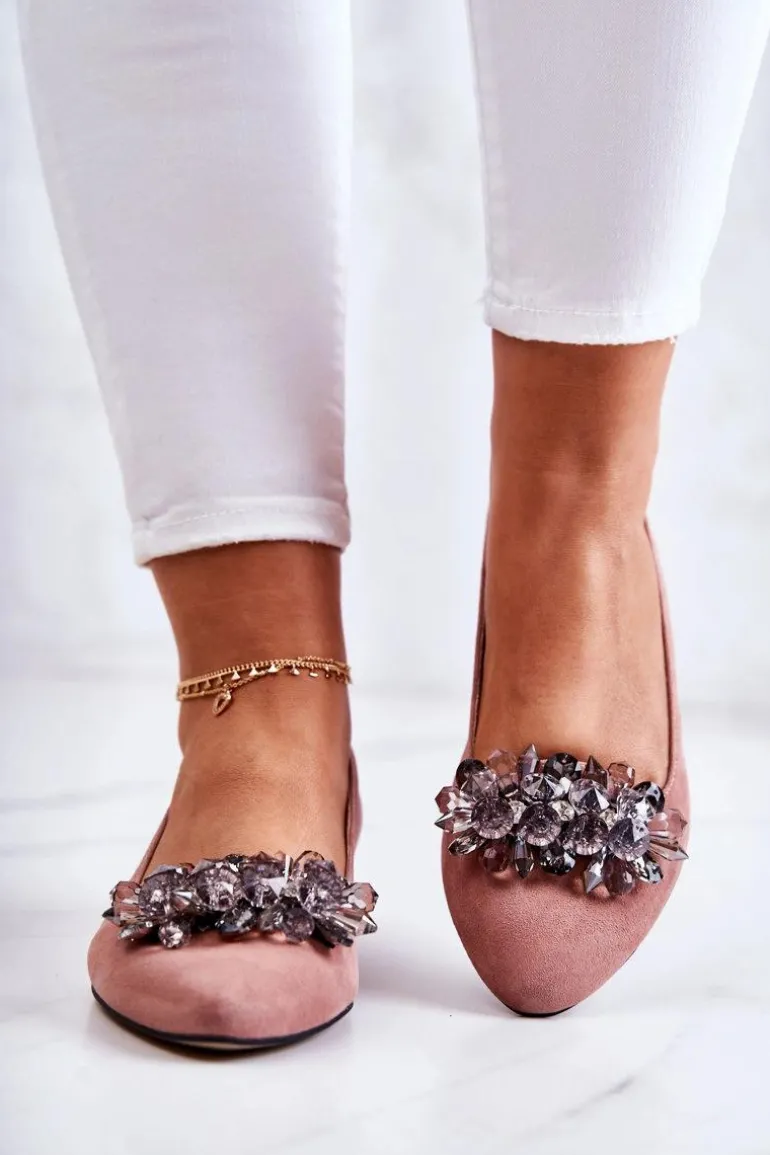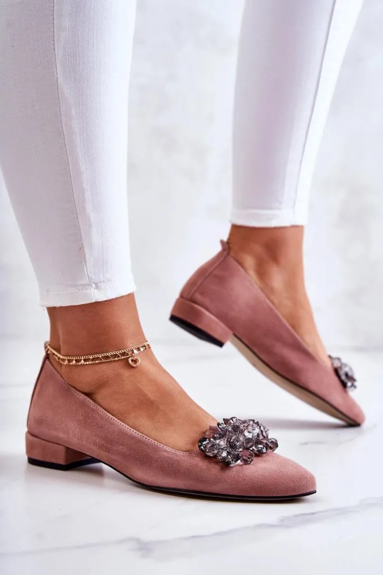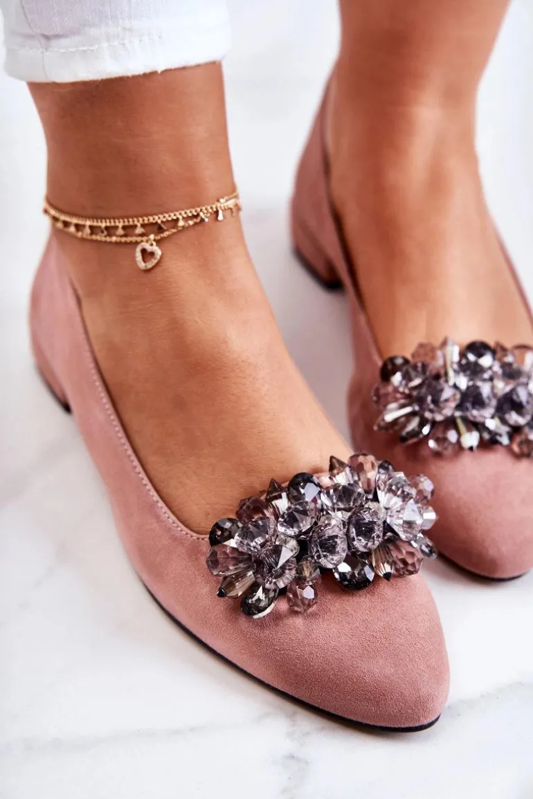 Eleganckie baleriny wykonane z wysokiej jakości naturalnego zamszu. Posiadają nosek w szpic. Model wsuwany. Osadzone na niewielkim, płaskim obcasie. Na przodzie znajduje się cudowna ozdoba wykonana z imitacji kryształów. Wkładka wykonana z naturalnej skóry jest bardzo miękka i wygodna podczas użytkowania. W tych balerinach poczujesz się niezwykle swobodnie. Komfort użytkowania gwarantowany! Koniecznie powinnaś je mieć w swojej garderobie! Przy wyborze rozmiaru prosimy sugerować się tabelą rozmiarów.