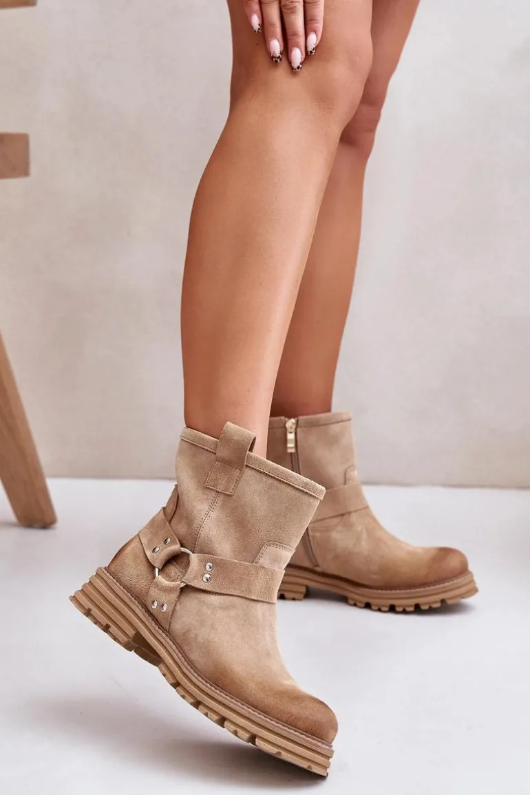 Botki wykonane z naturalnego zamszu to idealny wybór na każdą okazję. Osadzone na płaskim obcasie, zapewniają komfort i stabilność podczas chodzenia. Zaokrąglone noski dodają subtelnego charakteru. Model zapinany na zamek, co ułatwia zakładanie. Cholewka ozdobiona efektownym połączeniem pasków, które dodają stylowego akcentu. Te botki świetnie sprawdzą się w codziennych stylizacjach, łącząc elegancję z wygodą. Przy wyborze rozmiaru prosimy sugerować się tabelą rozmiarów.