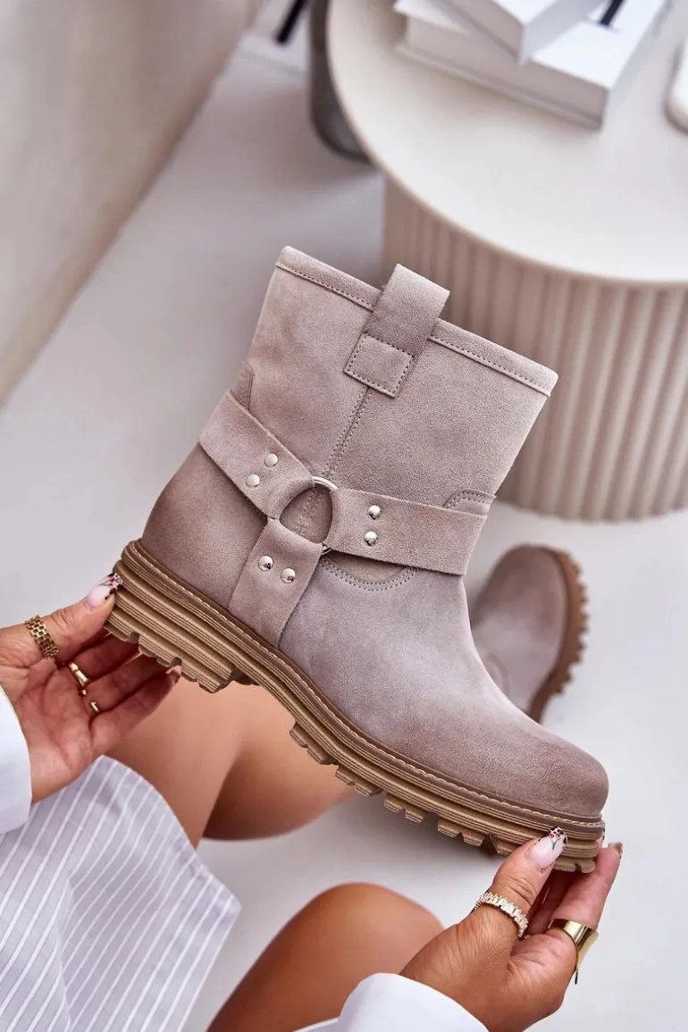 Botki wykonane z naturalnego zamszu to idealny wybór na każdą okazję. Osadzone na płaskim obcasie, zapewniają komfort i stabilność podczas chodzenia. Zaokrąglone noski dodają subtelnego charakteru. Model zapinany na zamek, co ułatwia zakładanie. Cholewka ozdobiona efektownym połączeniem pasków, które dodają stylowego akcentu. Te botki świetnie sprawdzą się w codziennych stylizacjach, łącząc elegancję z wygodą. Przy wyborze rozmiaru prosimy sugerować się tabelą rozmiarów.