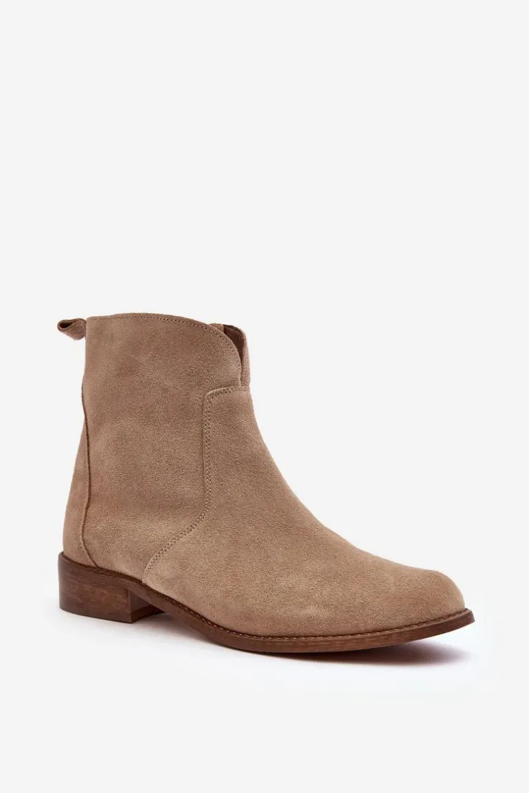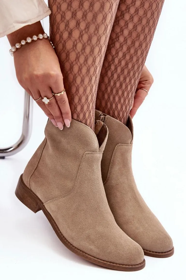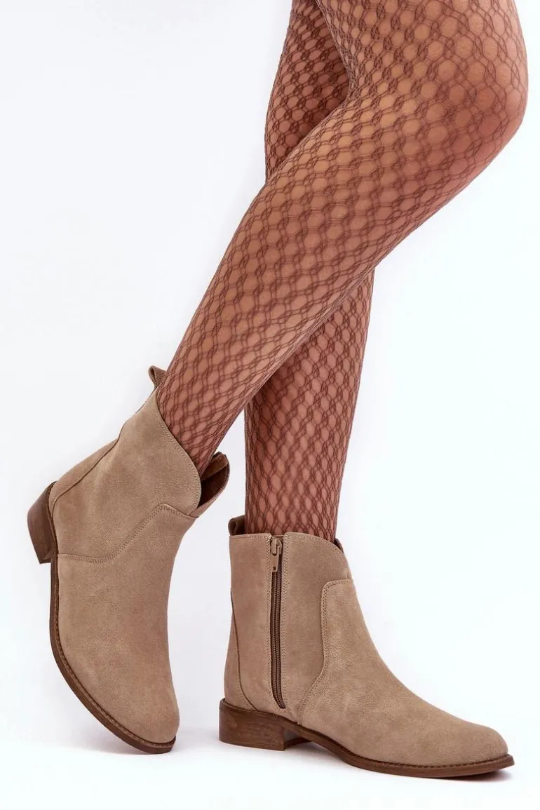 Botki damskie wykonane ze skóry naturalnej. Osadzone na płaskim obcasie. Cholewka za kostkę. Zapinane na suwak z boku. Wkładka wykonana również ze skóry naturalnej zapewni komfort podczas użytkowania. Noski zaokrąglone. Zapiętek usztywniony. Nieocieplane. Przy wyborze rozmiaru prosimy sugerować się tabelą rozmiarów.