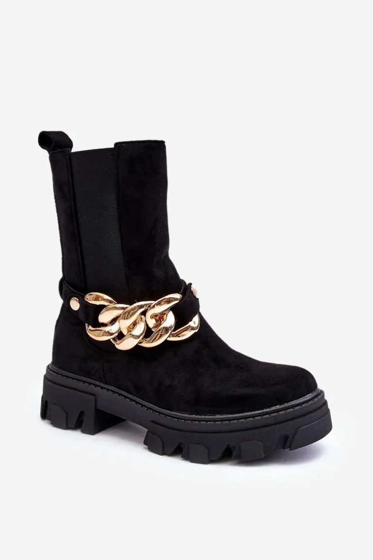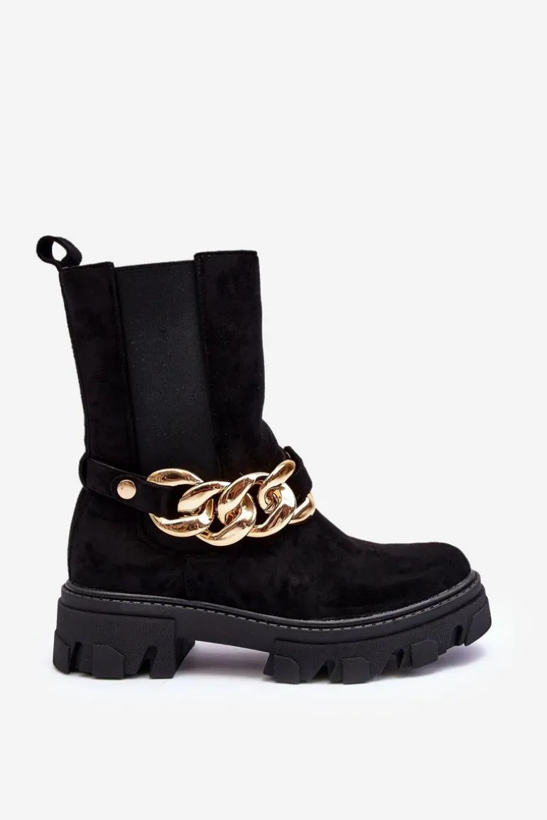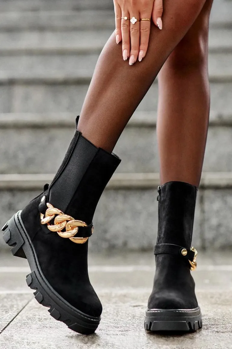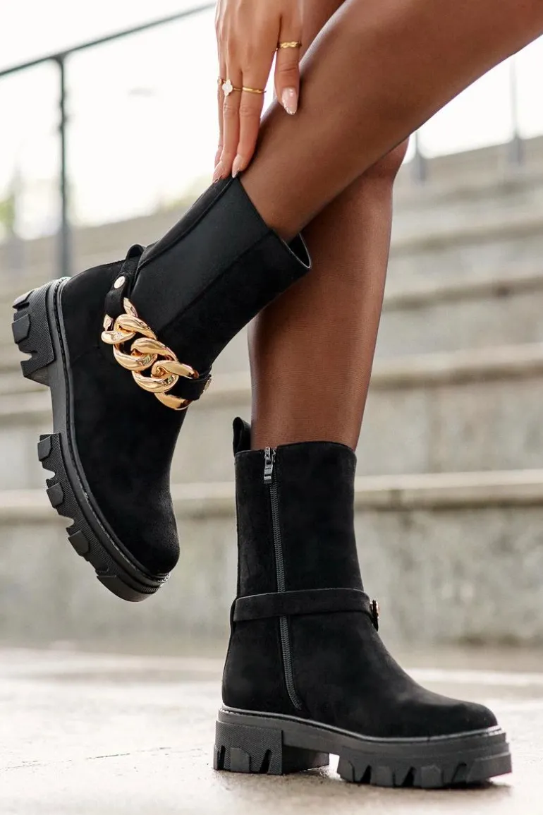 Modne damskie botki z wyższą cholewką wykonaną z eko zamszu. Zapinane na suwak po wewnętrznej stronie. Osadzone na płaskim obcasie i platformie ze żłobieniami. Cholewka ozdobiona ściąganym paskiem z łańcuchem. Świetny model do wielu stylizacji! Przy wyborze rozmiaru prosimy sugerować się tabelą rozmiarów.