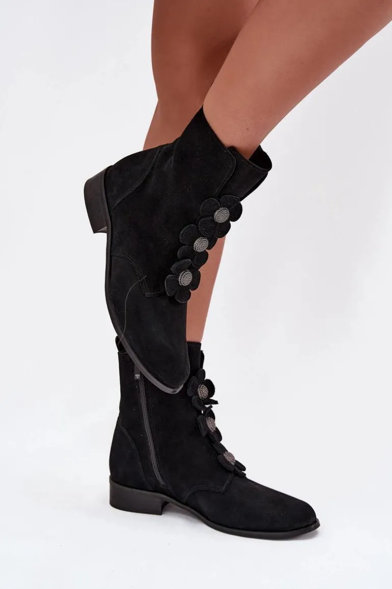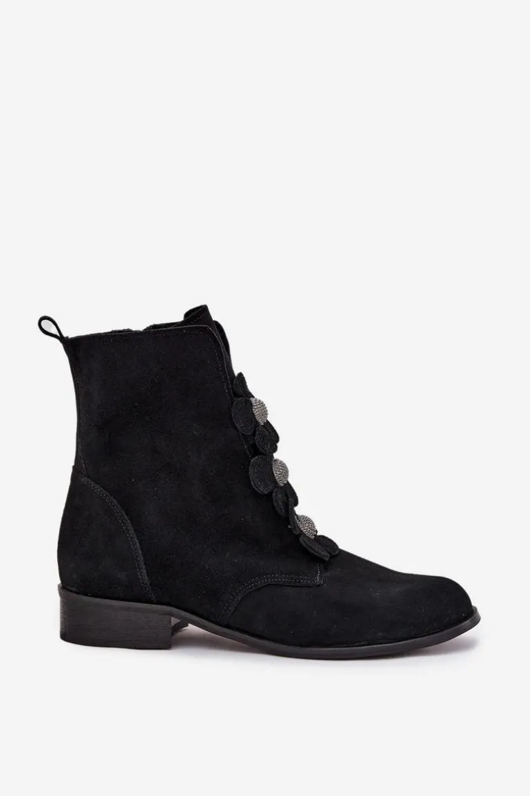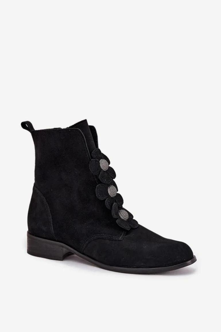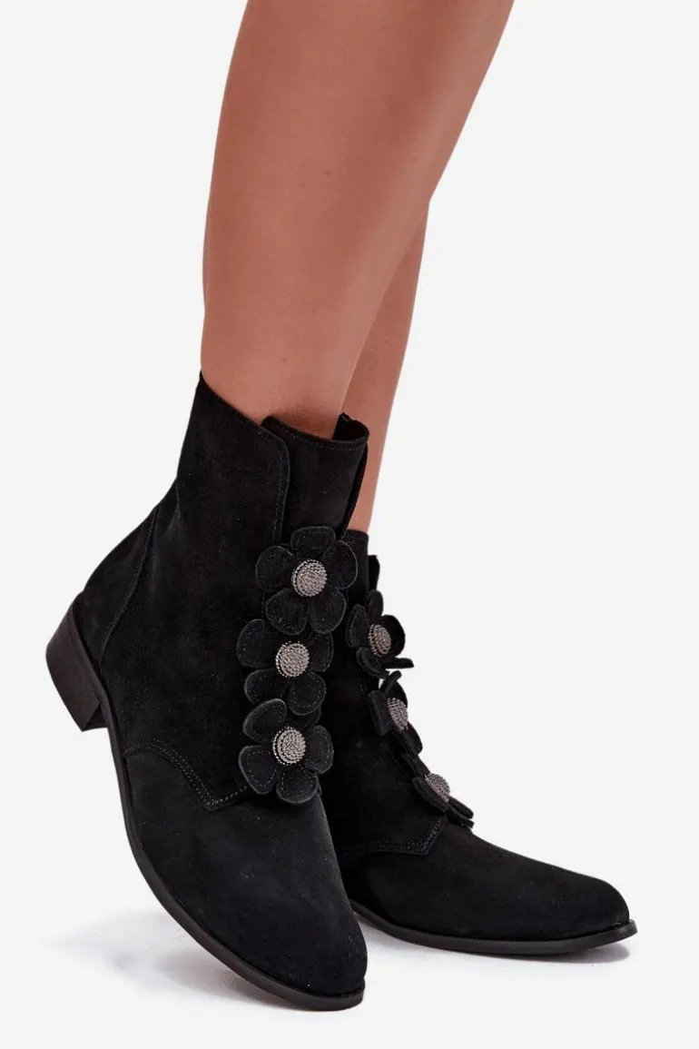 Botki damskie z naturalnego zamszu to doskonały wybór dla kobiet ceniących elegancję i subtelność. Wykonane z wysokiej jakości materiału, oferują nie tylko estetyczny wygląd, ale także komfort noszenia przez cały dzień. Zapinane na zamek błyskawiczny. Przód buta ozdobiony jest pięknymi, urokliwymi kwiatkami, które nadają im niepowtarzalnego, delikatnego charakteru. Dzięki temu stanowią doskonały dodatek do zarówno codziennych, jak i bardziej eleganckich stylizacji. Świetnie komponują się z sukienkami, spódnicami czy spodniami. Przy wyborze rozmiaru prosimy sugerować się tabelą rozmiarów.