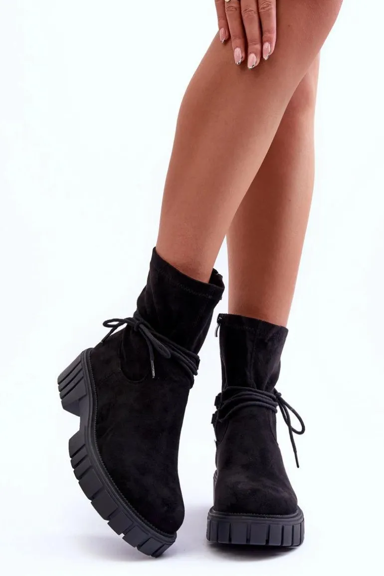 Klasyczne botki damskie zostały wykonane z miłego w dotyku eko zamszu. Zapinane są z boku cholewki na suwak. Cholewka wzbogacona została wiązaniem. Botki posiadają usztywniany zapiętek. Osadzone na platformie oraz masywnym, płaskim obcasie. Przy wyborze rozmiaru prosimy sugerować się tabelą rozmiarów.