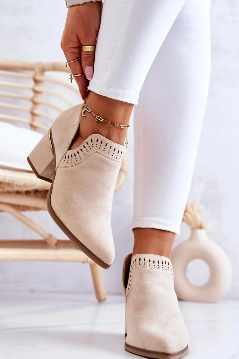 Modny fason w stylu kowbojek wykonane z eko zamszu w ażurowy wzorek. Buty posiadają nosek w szpic oraz stabilny obcas w postaci słupka. Botki idealnie wpasują się w wiosenno-letnie stylizacje. W środku posiadają eko skórzaną wkładkę. Koniecznie musisz je mieć! Przy wyborze rozmiaru prosimy sugerować się tabelą rozmiarów.
