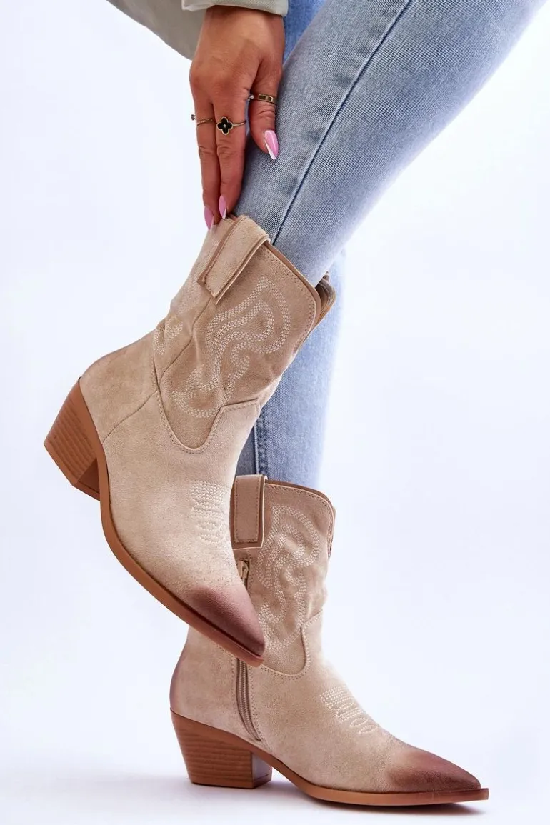 Modne botki damskie zostały wykonane z eko zamszu z przeszyciami i cieniowaniem na przodzie oraz tyle cholewki. Kowbojki na masywnym słupku zapewniają stabilność podczas użytkowania. Wsuwane oraz zapinane z boku na zamek błyskawiczny. Posiadają dodatkowo usztywniany zapiętek. Botki w stylu kowbojek będą świetnym uzupełnieniem wielu stylizacji. Przy wyborze rozmiaru prosimy sugerować się tabelą rozmiarów.