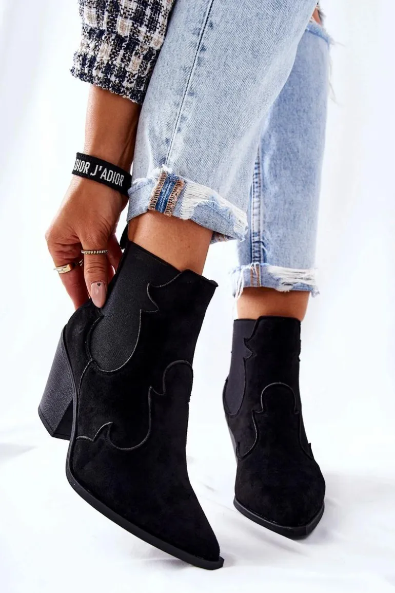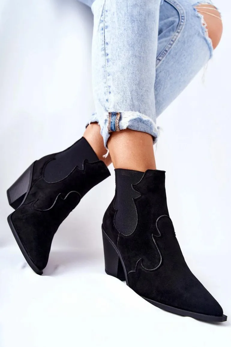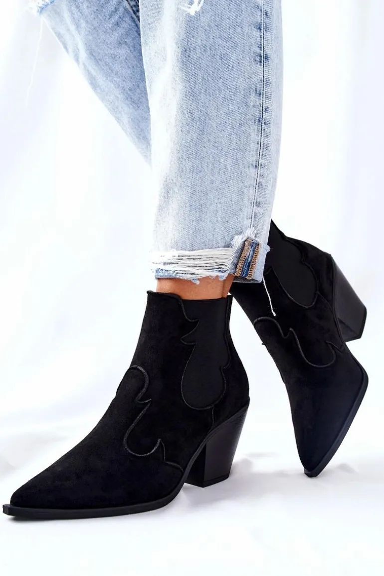 Niezwykły i stylowy model botków! Wykonane z eko zamszu. Posiadają na cholewce z obu stron ściągacze oraz delikatne ocieplenie. Modny wzór w stylu kowbojskim nadaje botkom wyjątkowości! Nosek w szpic. Stabilny obcas. Skorzystaj z oferty już dziś i kup zanim znikną! Przy wyborze rozmiaru prosimy sugerować się tabelą rozmiarów.