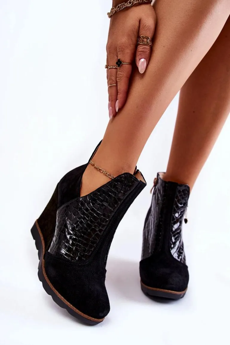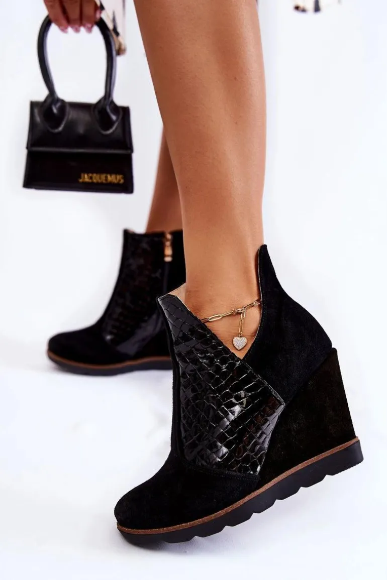 Zamszowe Botki Na Koturnie Krokodyli Wzór Czarne Alda