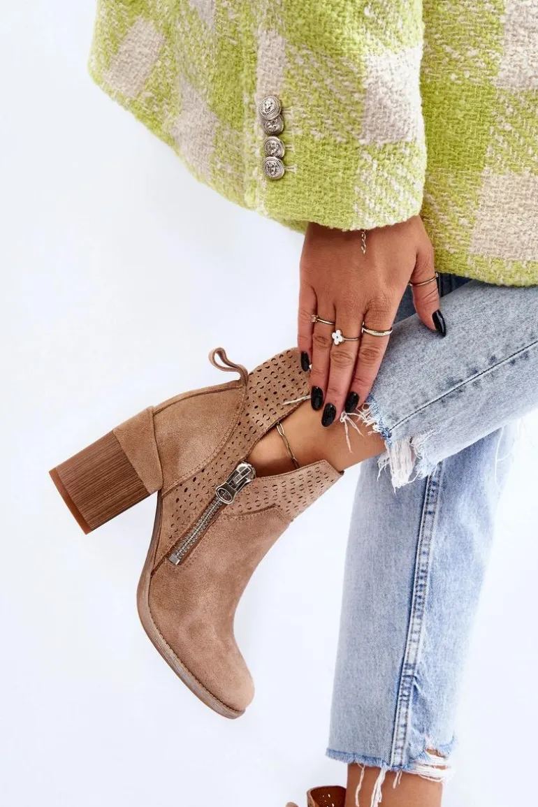 Modne botki na masywnym obcasie w postaci klocka zostały wykonane z eko zamszu z wycięciami po bokach cholewki. Dodatkowo zostały ozdobione ażurowym wzorkiem. Model ten posiada dodatkowy suwak z boku cholewki. Zapiętek w tych botkach jest usztywniany. Miękka i wygodna wkładka została wykonana z eko skóry. Powinnaś mieć ten model w swojej szafie! Przy wyborze rozmiaru prosimy sugerować się tabelą rozmiarów.
