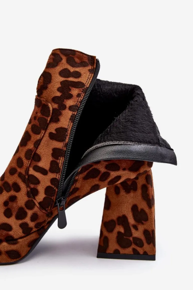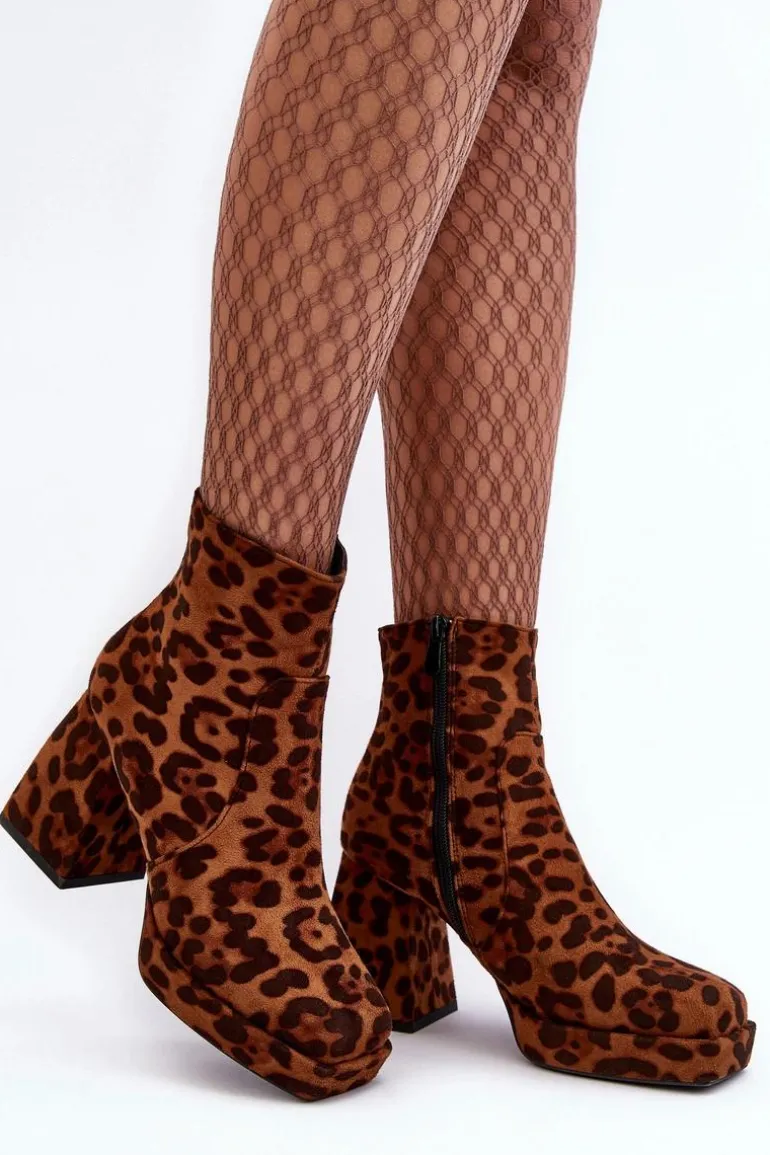 Botki Damskie osadzone na masywnym, wysokim klocku i platformie. Wykonane z eko zamszu. Zapinane na suwak po wewnętrznej stronie cholewki. Środek ocieplony kocem obuwniczym. Noski w kwadrat. Zapiętek jest usztywniony. Przy wyborze rozmiaru prosimy sugerować się tabelą rozmiarów.