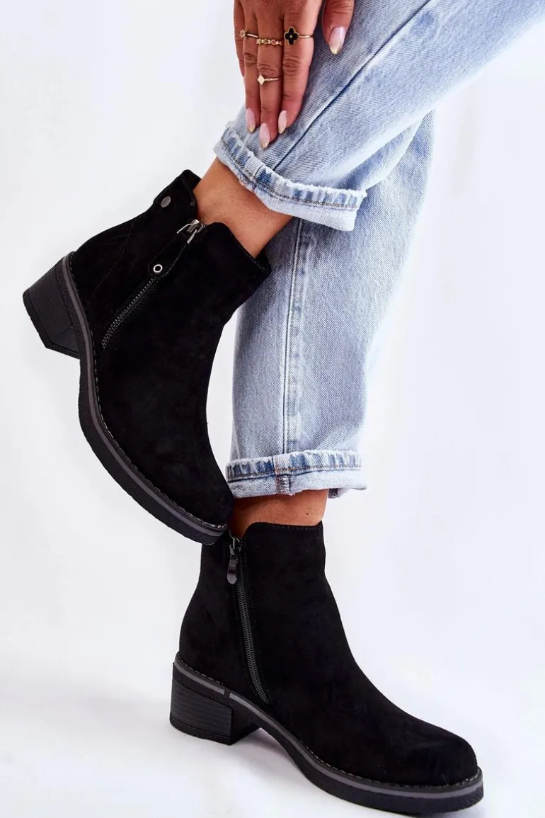 Klasyczne botki damskie osadzone na obcasie w postaci niskiego słupka. Podeszwa wykonana z gumowego tworzywa jest dodatkowo antypoślizgowa. Model posiada dwa suwaki – jeden z nich jest ozdobny. Buty zostały wykonane z eko zamszu z cholewką za kostkę. Posiadają usztywniany zapiętek. W środku ocieplane miłym w dotyku kocem obuwniczym. Świetny model na chłodniejsze dni! Przy wyborze rozmiaru prosimy sugerować się tabelą rozmiarów.