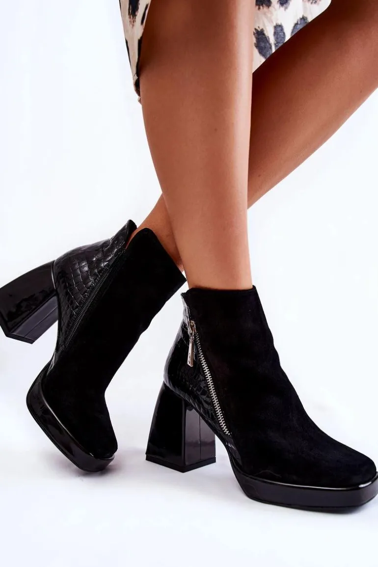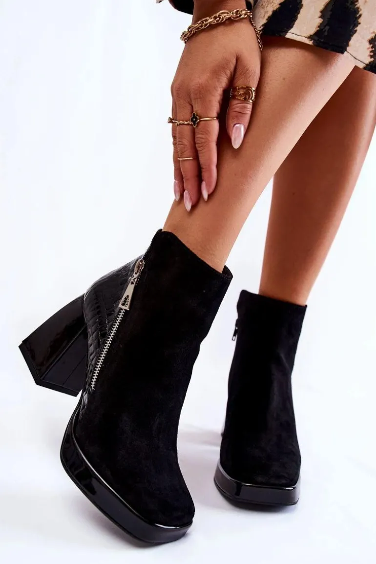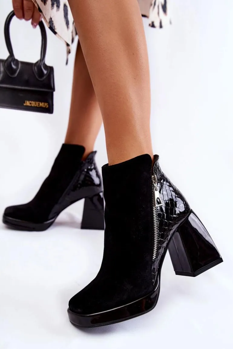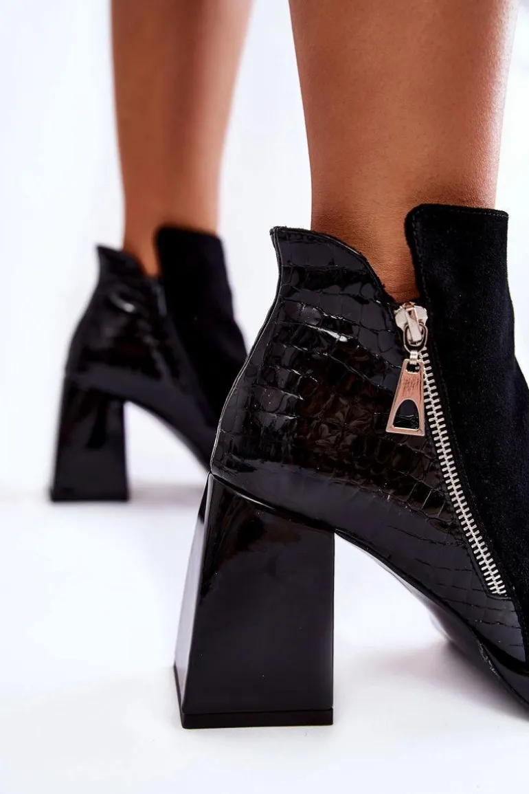 Botki zostały wykonane z naturalnej skóry z dbałością o detale. Ocieplone w środku kocem obuwniczym. Botki zostały osadzone na masywnym obcasie w postaci klocka oraz delikatnej platformie. Zapinane na suwak. Usztywniany zapiętek zapewni stabilizację stopy. Botki dodatkowo posiadają ozdobny zamek po zewnętrznej stronie cholewki. Ten modny fason powinien znaleźć się w Twojej szafie! Przy wyborze rozmiaru prosimy sugerować się tabelą rozmiarów.