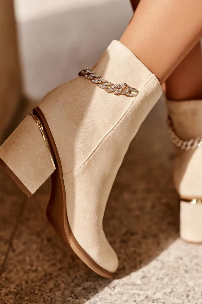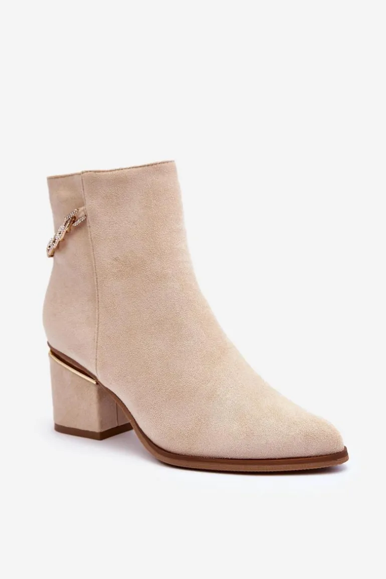Eleganckie botki za kostkę zostały wykonane z miłego w dotyku eko zamszu. Osadzone na obcasie z lustrzanym elementem. Na cholewce biżuteryjna ozdoba. Model zapinany jest na suwak. Zapiętek usztywniony, wnętrze ocieplone kocem obuwniczym. Przy wyborze rozmiaru prosimy sugerować się tabelą rozmiarów.