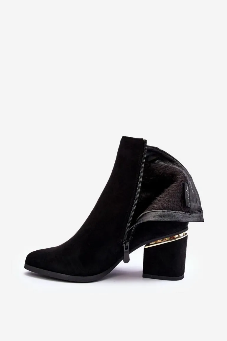 Eleganckie botki za kostkę zostały wykonane z miłego w dotyku eko zamszu. Osadzone na obcasie z lustrzanym elementem. Na cholewce biżuteryjna ozdoba. Model zapinany jest na suwak. Zapiętek usztywniony, wnętrze ocieplone kocem obuwniczym. Przy wyborze rozmiaru prosimy sugerować się tabelą rozmiarów.