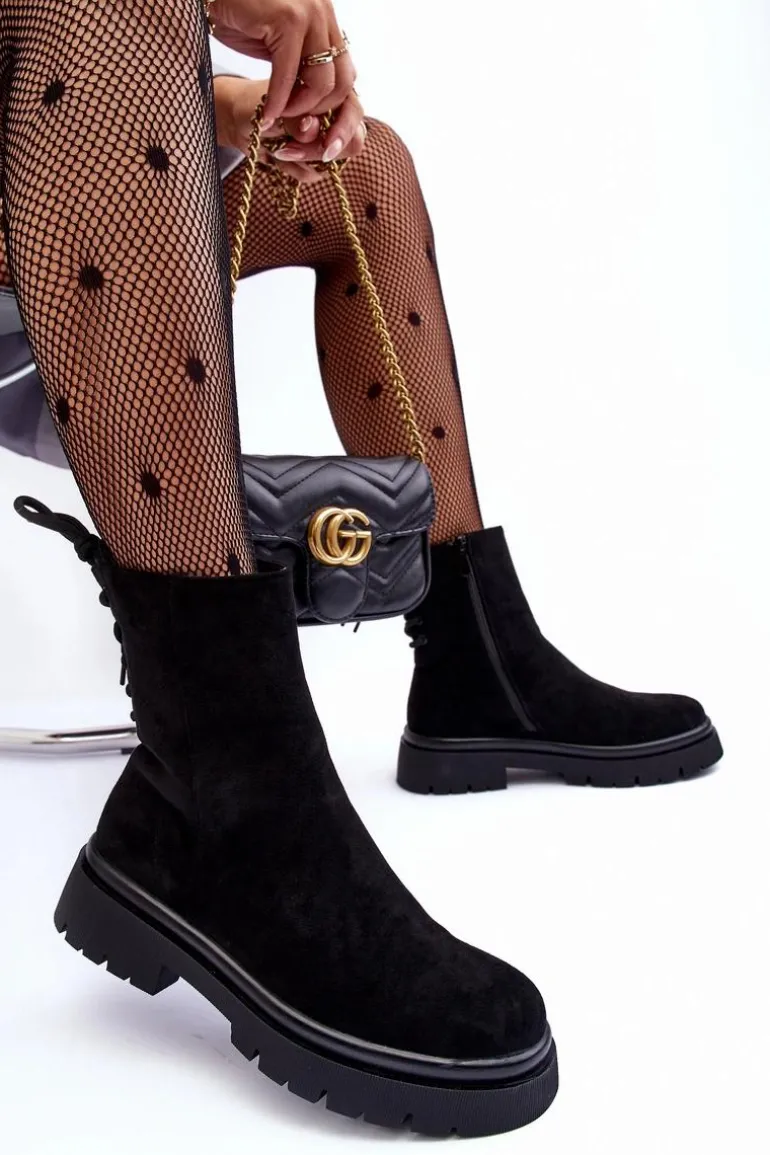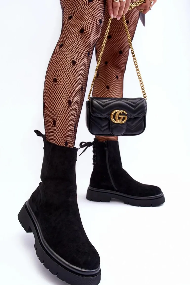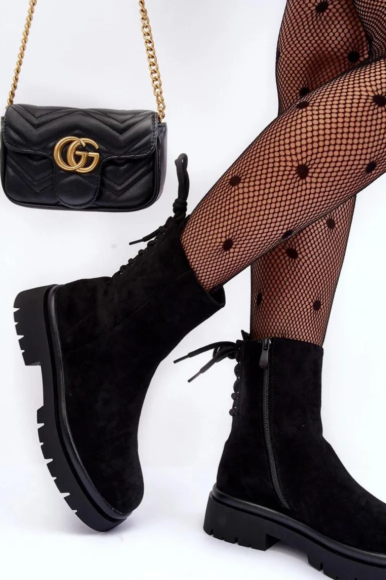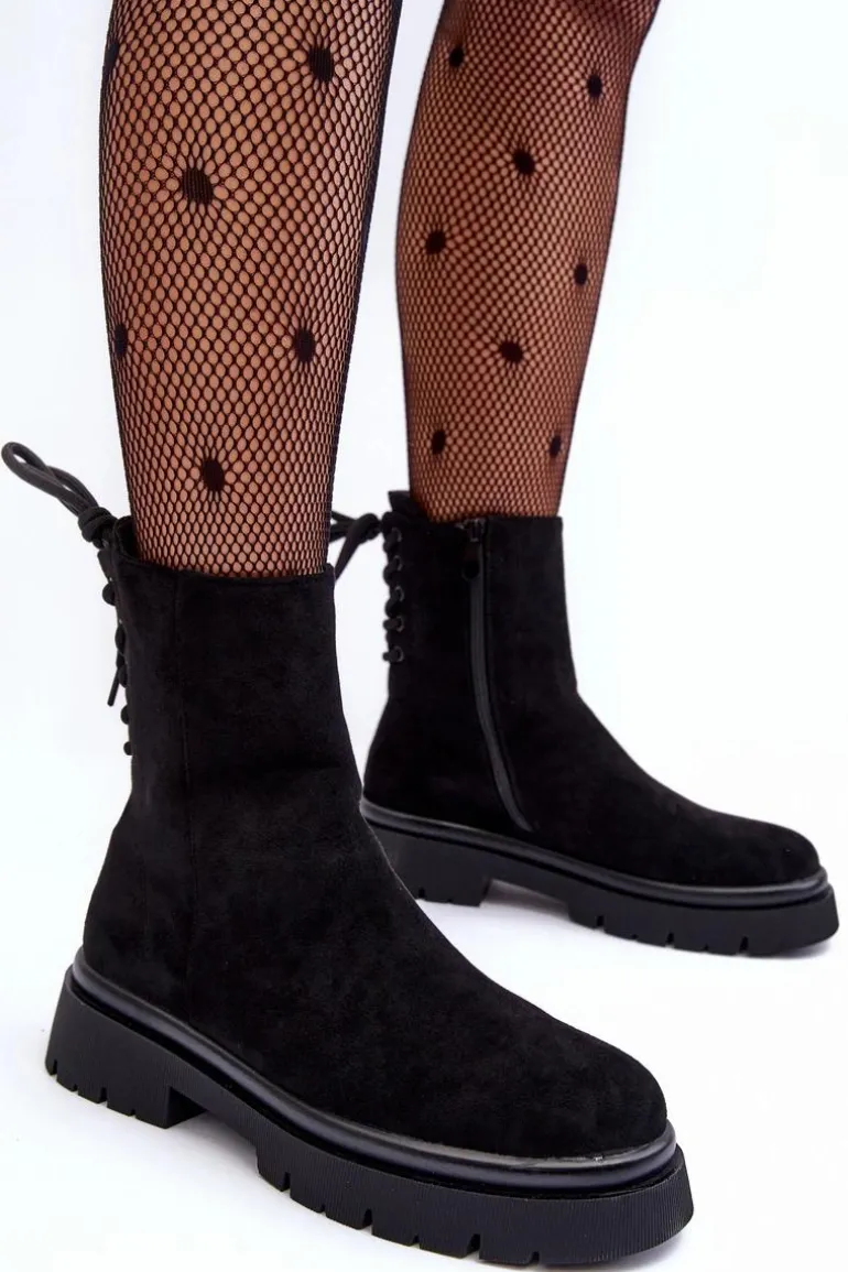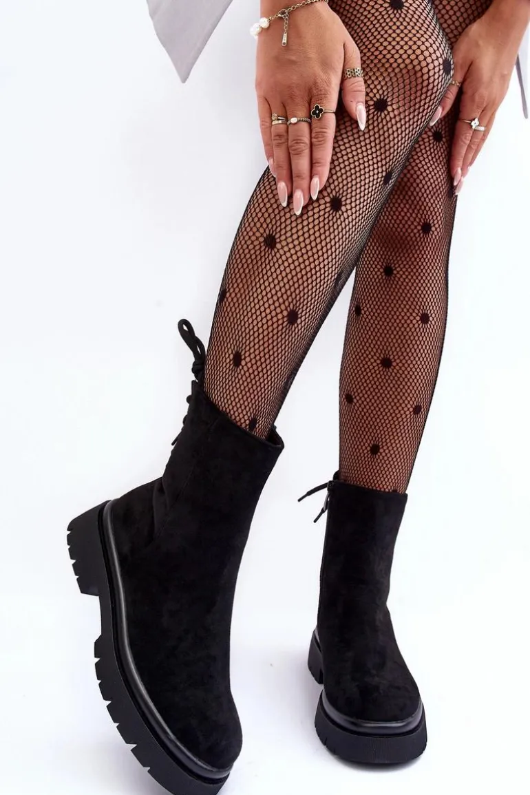 Botki damskie wykonane z eko zamszu. Osadzone na płaskim, stabilnym obcasie i platformie. Wnętrze ocieplone kocem obuwniczym. Noski zaokrąglone. Cholewka ozdobiona z tyłu sznurowaniem. Model ten zapinany jest na suwak. Idealne do jesiennych i zimowych stylizacji! Przy wyborze rozmiaru prosimy sugerować się tabelą rozmiarów.