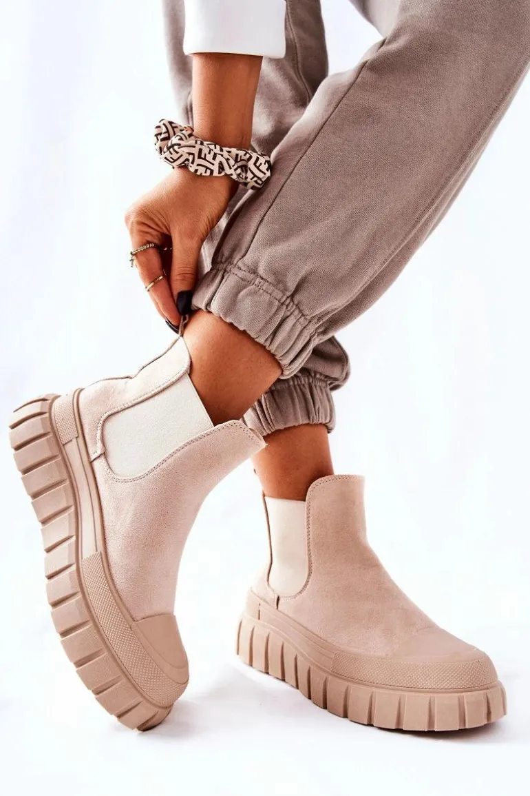 Botki zostały wykonane z eko zamszu. Gumy ściągające na wysokości cholewki zapewnią dopasowanie do nogi oraz wygodę. Wysoka platforma sprawia, że buty są komfortowe w noszeniu. Środek jest ocieplony delikatnym, przyjemnym w dotyku futerkiem. Botki posiadają wzmocnienie na przodzie w postaci gumy. Przy wyborze rozmiaru prosimy sugerować się tabelą rozmiarów.