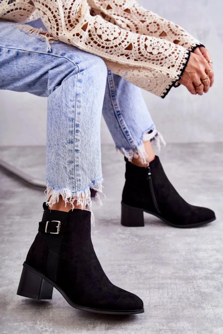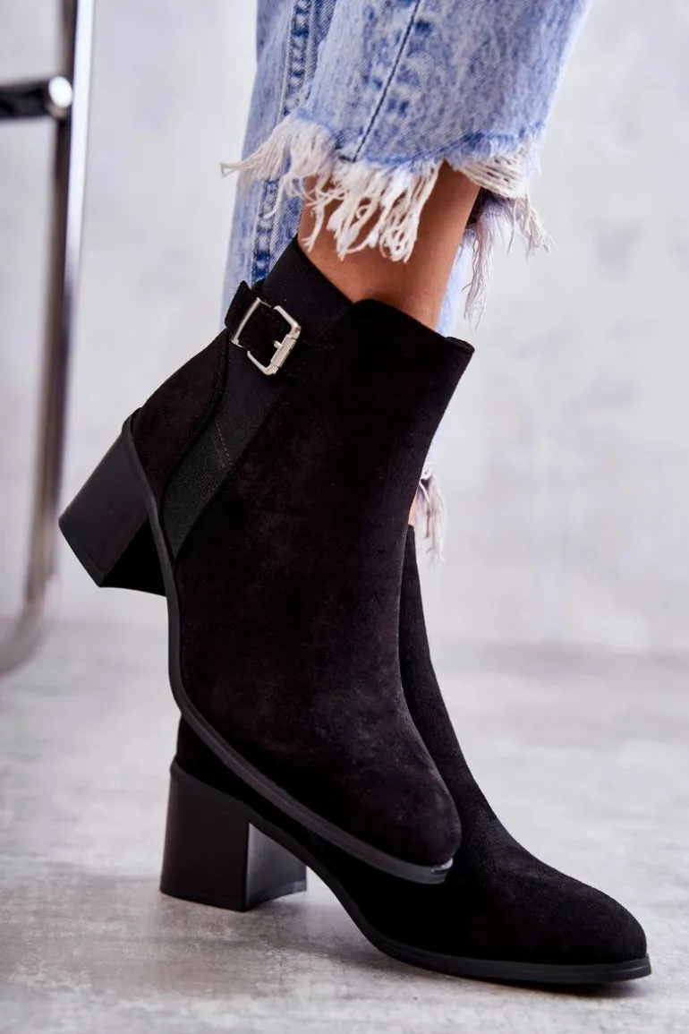 Botki wykonane z eko zamszu. Wnętrze zostało ocieplone miłym w dotyku kocem obuwniczym. Z boku cholewki znajduje się także pasek zapinany na sprzączkę. Obcas w postaci masywnego słupka. Modny fason sprawia, że możesz założyć je do wielu stylizacji. Nosek zaokrąglony. Buty posiadają także usztywniany zapiętek. W tych botkach jesienne dni nie będą już takie straszne! Przy wyborze rozmiaru prosimy sugerować się tabelą rozmiarów.
