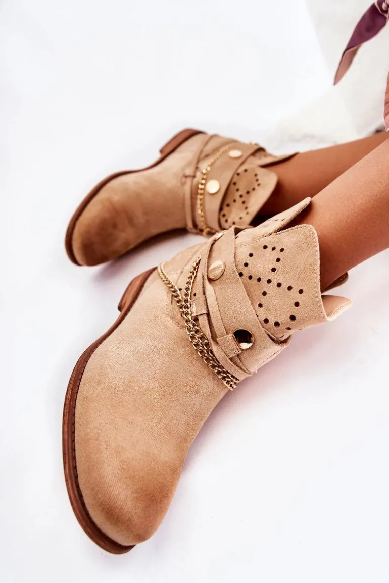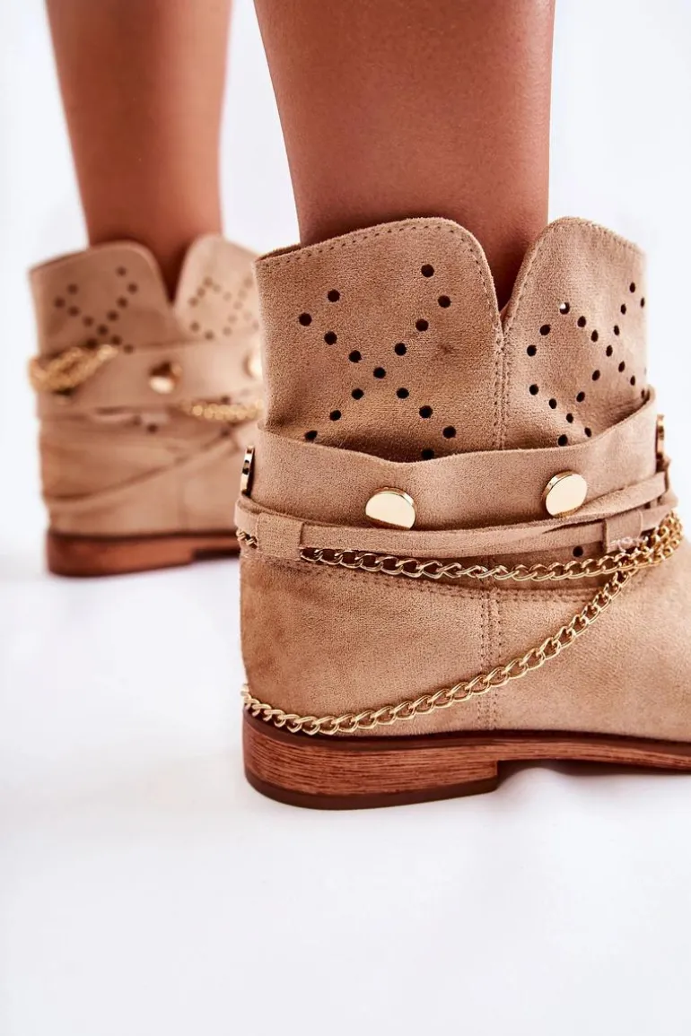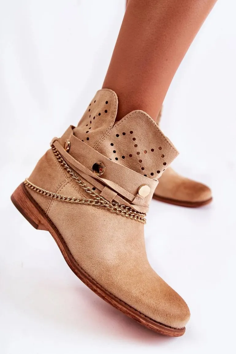 Botki na ukrytym koturnie i płaskim obcasie posiadają cholewką za kostkę, która jest delikatnie perforowana. Model wsuwany, wykonany z eko zamszu. Miękka wkładka z eko skóry pozwala na wygodne użytkowanie. Zapiętek usztywniany. Idealne na sezon wiosenno-jesienny. Botki posiadają osobno ściągane paseczki i łańcuszek, dlatego możesz je nosić razem z ozdobami lub bez. Przy wyborze rozmiaru prosimy sugerować się tabelą rozmiarów.