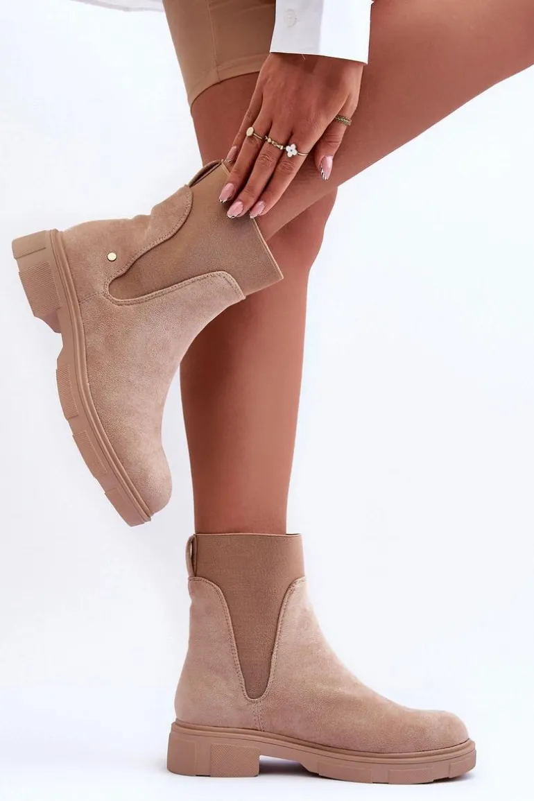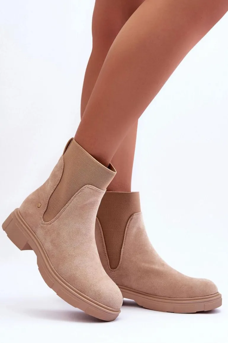 Damskie botki zostały wykonane z miłego w dotyku eko zamszu. Osadzono je na platformie i płaskim obcasie. Model ten posiada elastyczne wstawki na cholewce. Nie czekaj aż znikną i kup już dziś! Przy wyborze rozmiaru prosimy sugerować się tabelą rozmiarów.