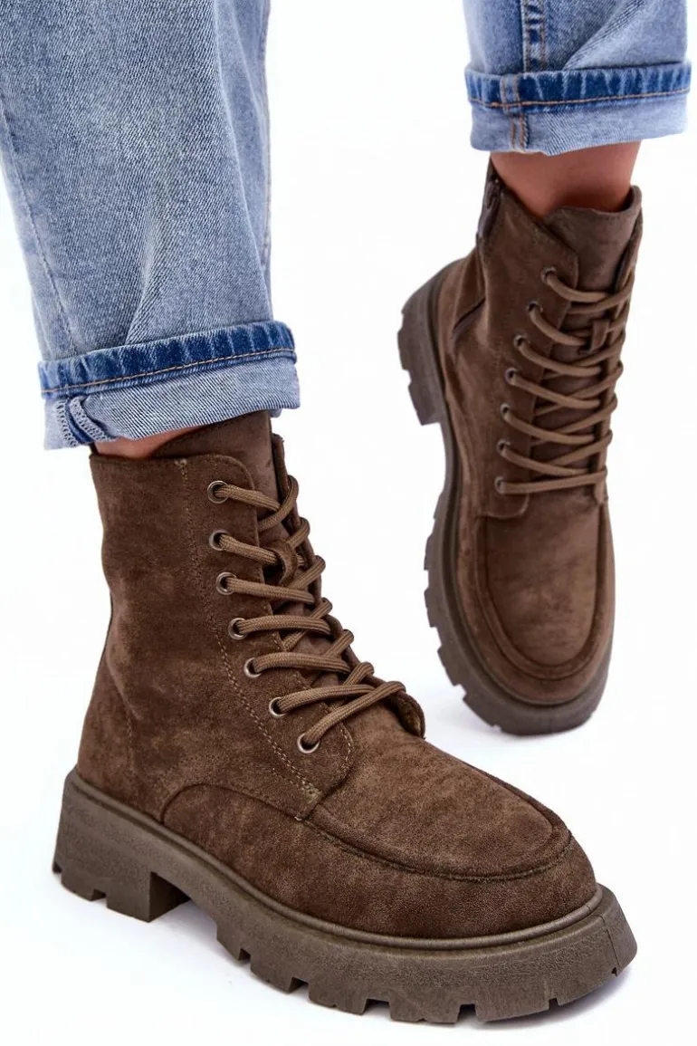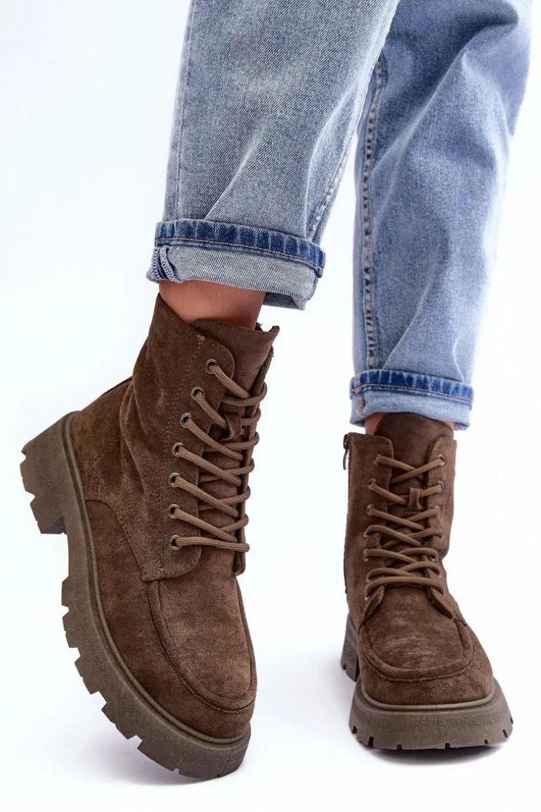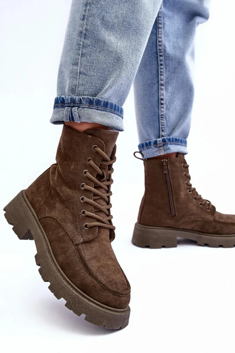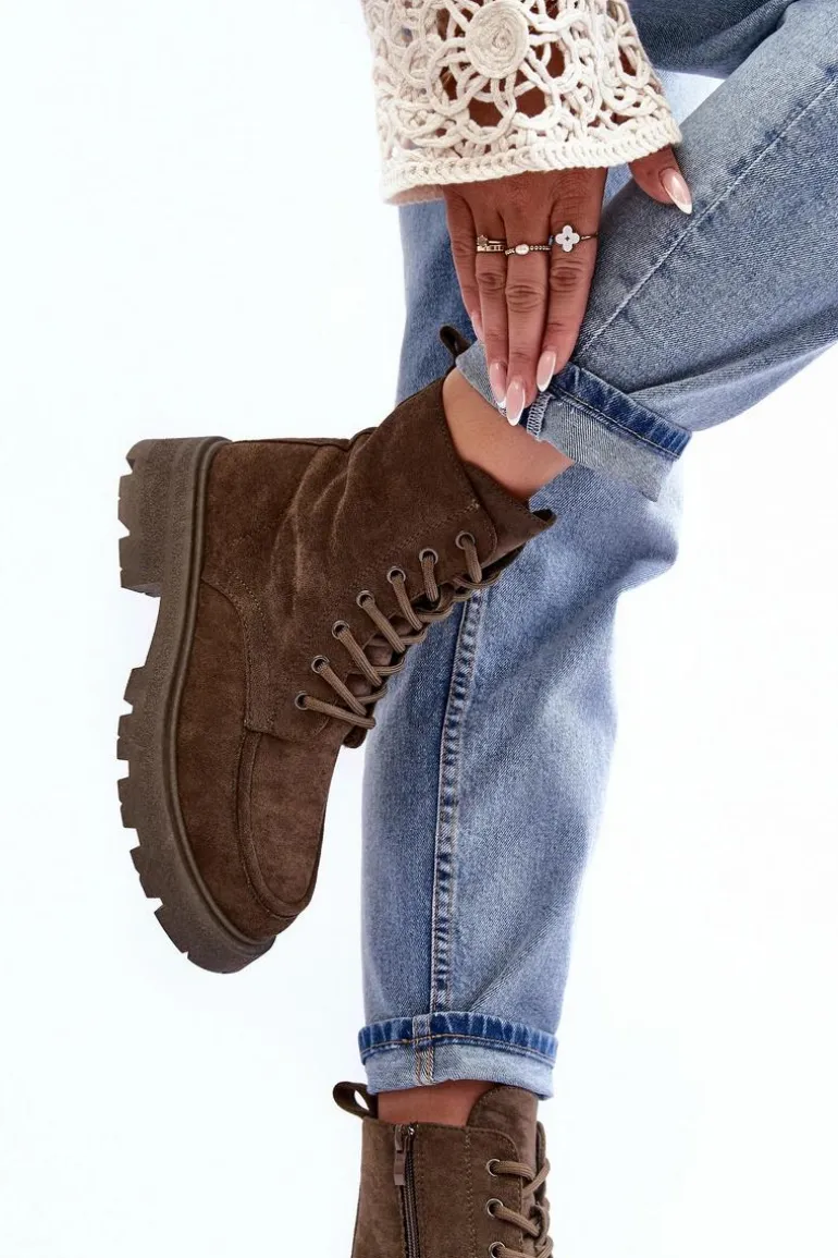 Trapery damskie wykonane z eko zamszu. Osadzone na płaskim, stabilnym obcasie oraz platformie. Środek ocieplony kocem obuwniczym. Model zapinany na suwak z boku oraz dodatkowo posiada sznurowanie. Przy wyborze rozmiaru prosimy sugerować się tabelą rozmiarów.