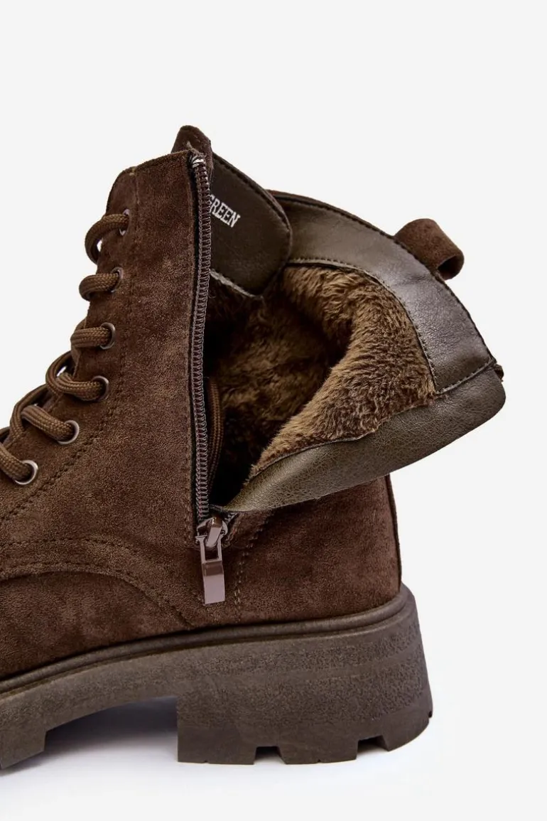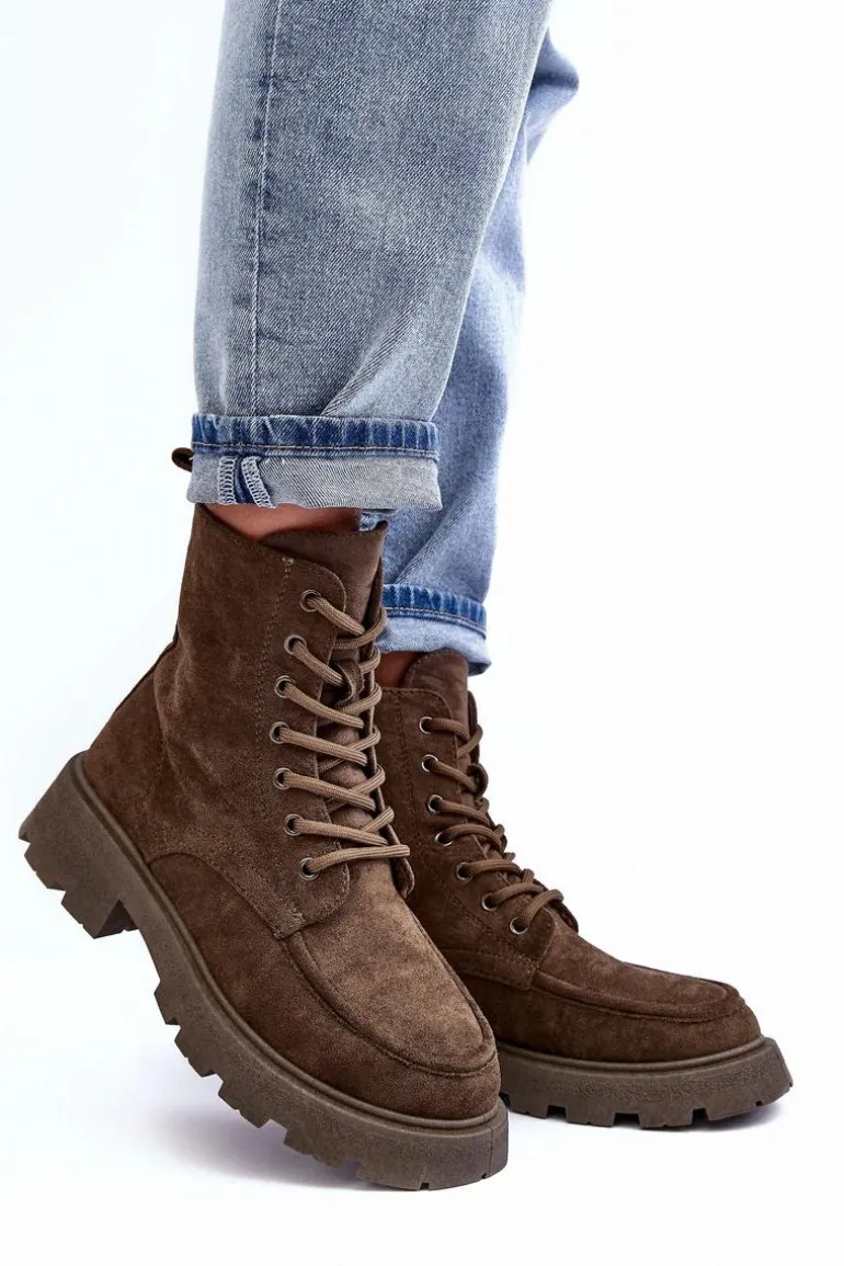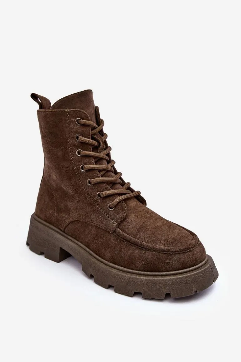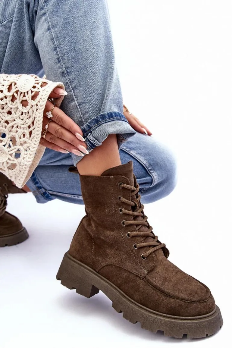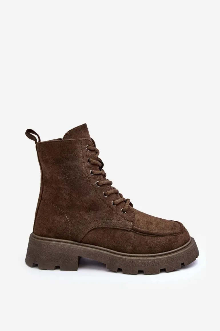 Trapery damskie wykonane z eko zamszu. Osadzone na płaskim, stabilnym obcasie oraz platformie. Środek ocieplony kocem obuwniczym. Model zapinany na suwak z boku oraz dodatkowo posiada sznurowanie. Przy wyborze rozmiaru prosimy sugerować się tabelą rozmiarów.