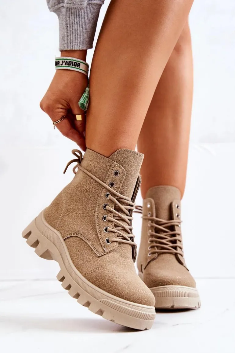 Śliczne trapery zachwycą niejedną miłośniczkę odważnych, modnych, a przede wszystkim wygodnych stylizacji! Wykonane z zamszowej eko skóry na zewnątrz. W środku wygodna wkładka została wykonana z eko skóry. O idealne dopasowanie do nóg zadba solidne sznurowanie. Traperowa podeszwa zadba o stabilność na nierównych nawierzchniach. Przy wyborze rozmiaru prosimy sugerować się tabelą rozmiarów.