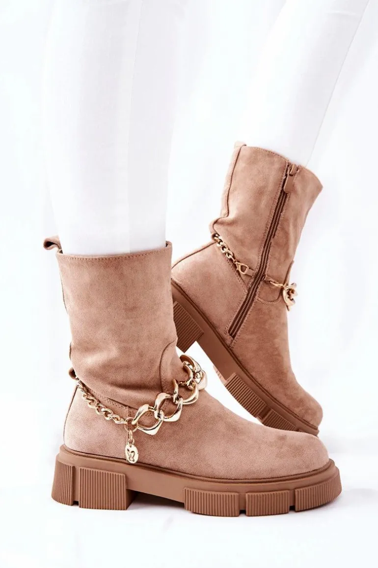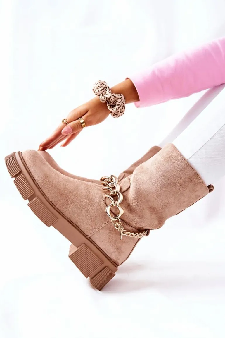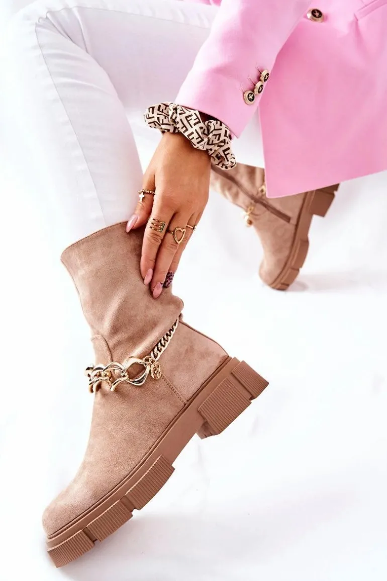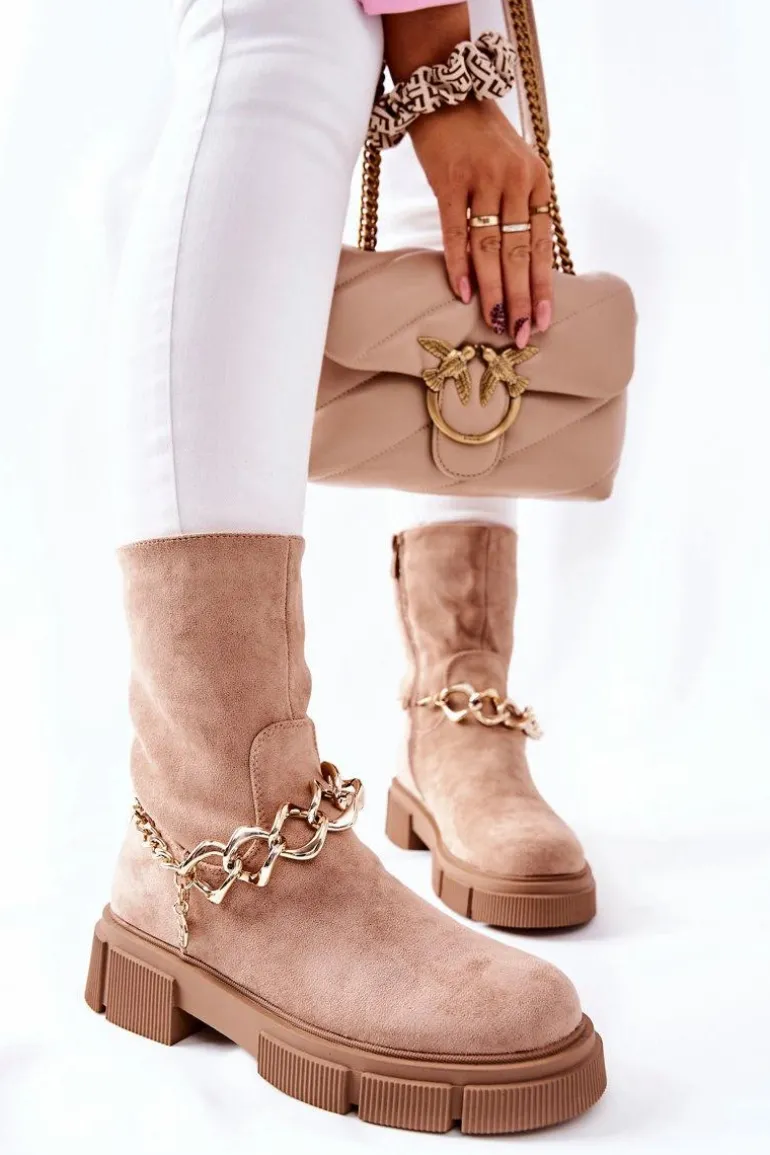 Piękne botki wykonane z eko zamszu będą idealne do wielu stylizacji. Gruba podeszwa sprawia, że botki są stabilne. Ozdobny łańcuch sprawia, że wyglądają bardzo stylowo. Zapinane na suwak. Środek ocieplany delikatnym futerkiem. Nie przegap okazji i kup je już dziś!Przy wyborze rozmiaru prosimy sugerować się tabelą rozmiarów.