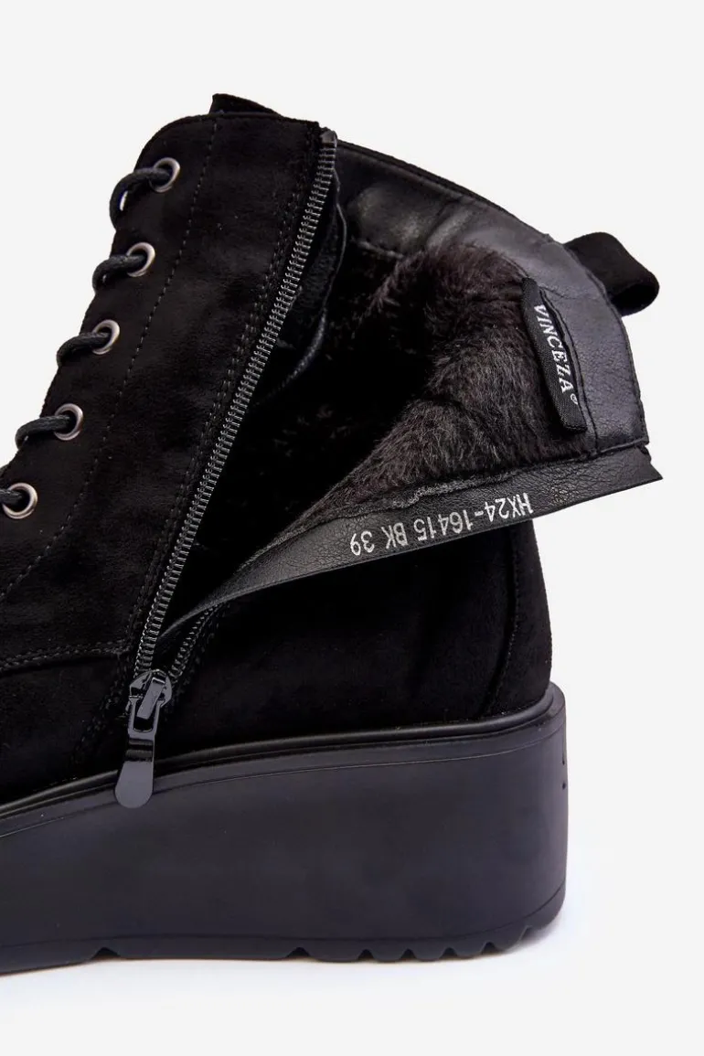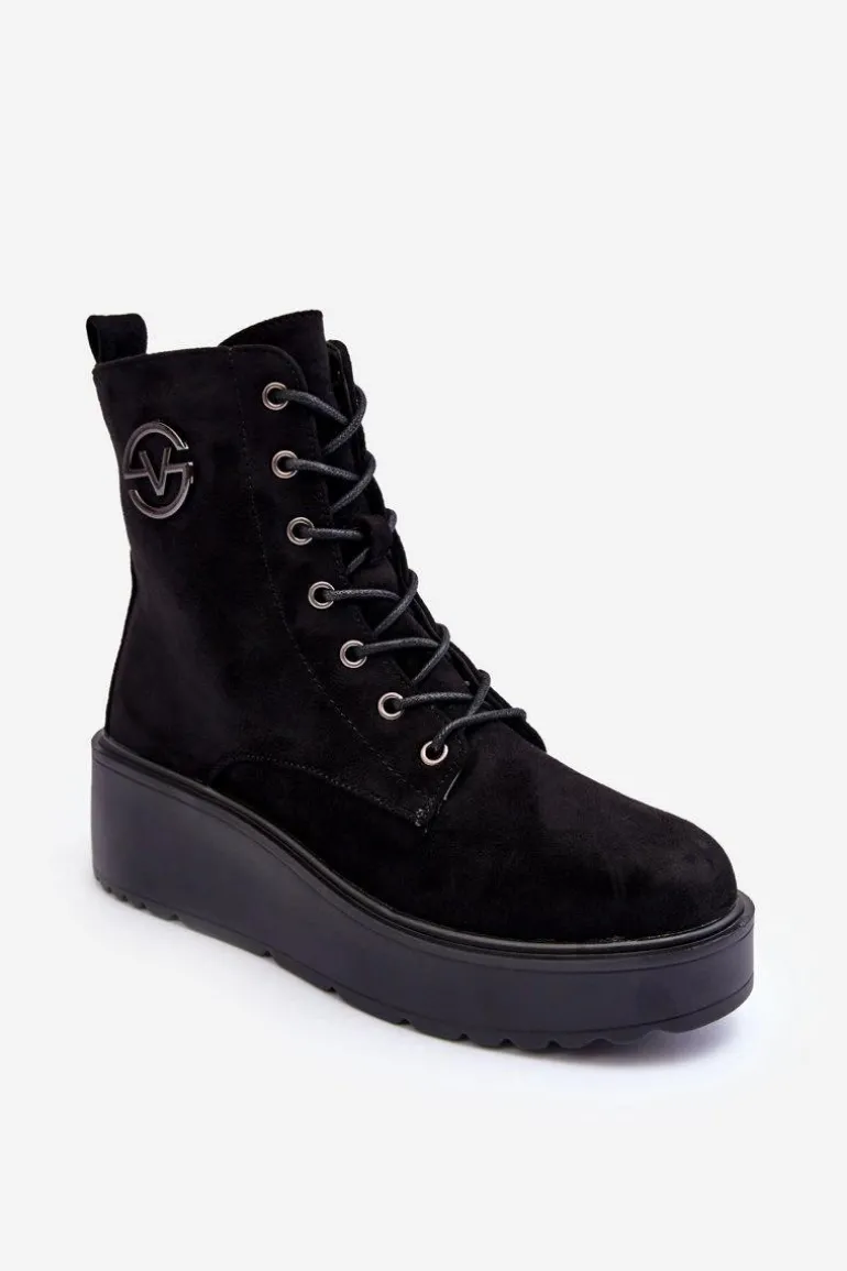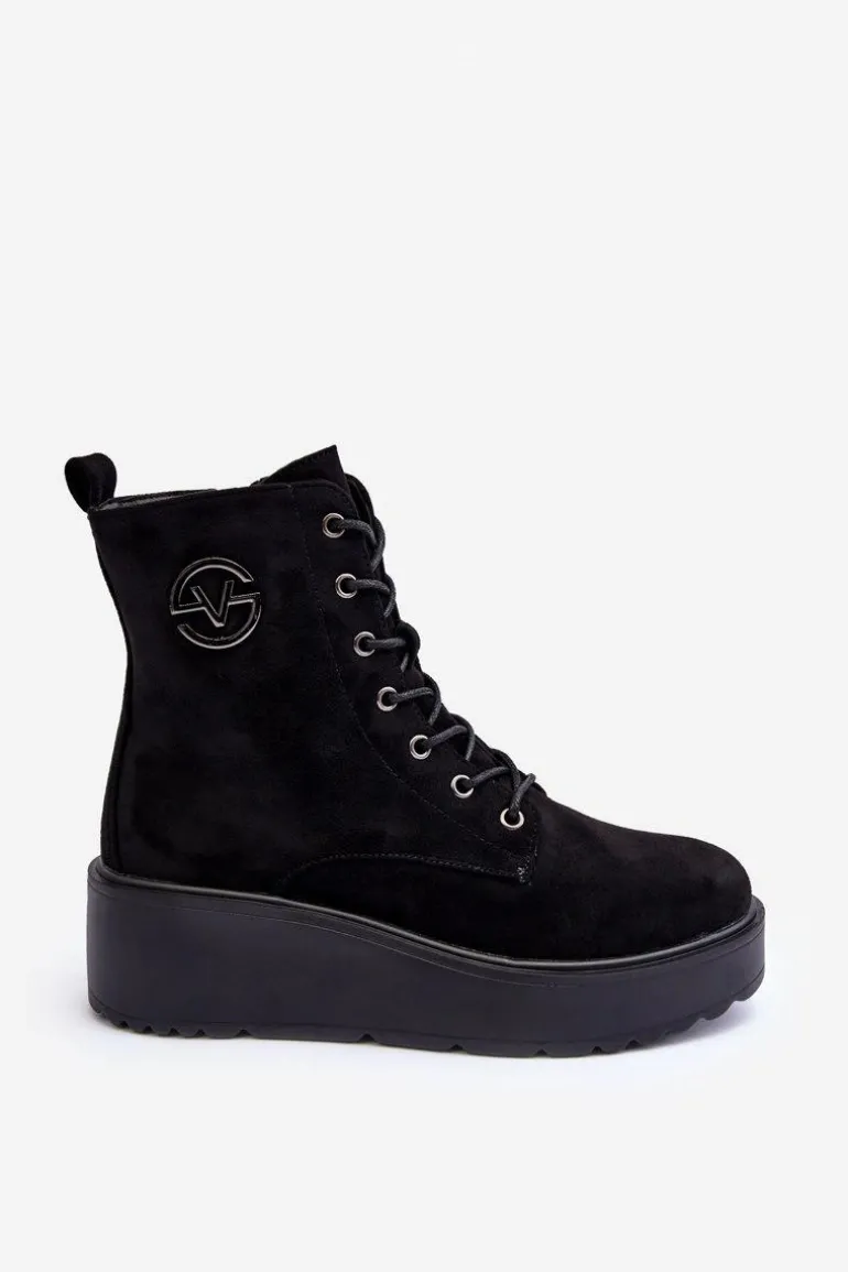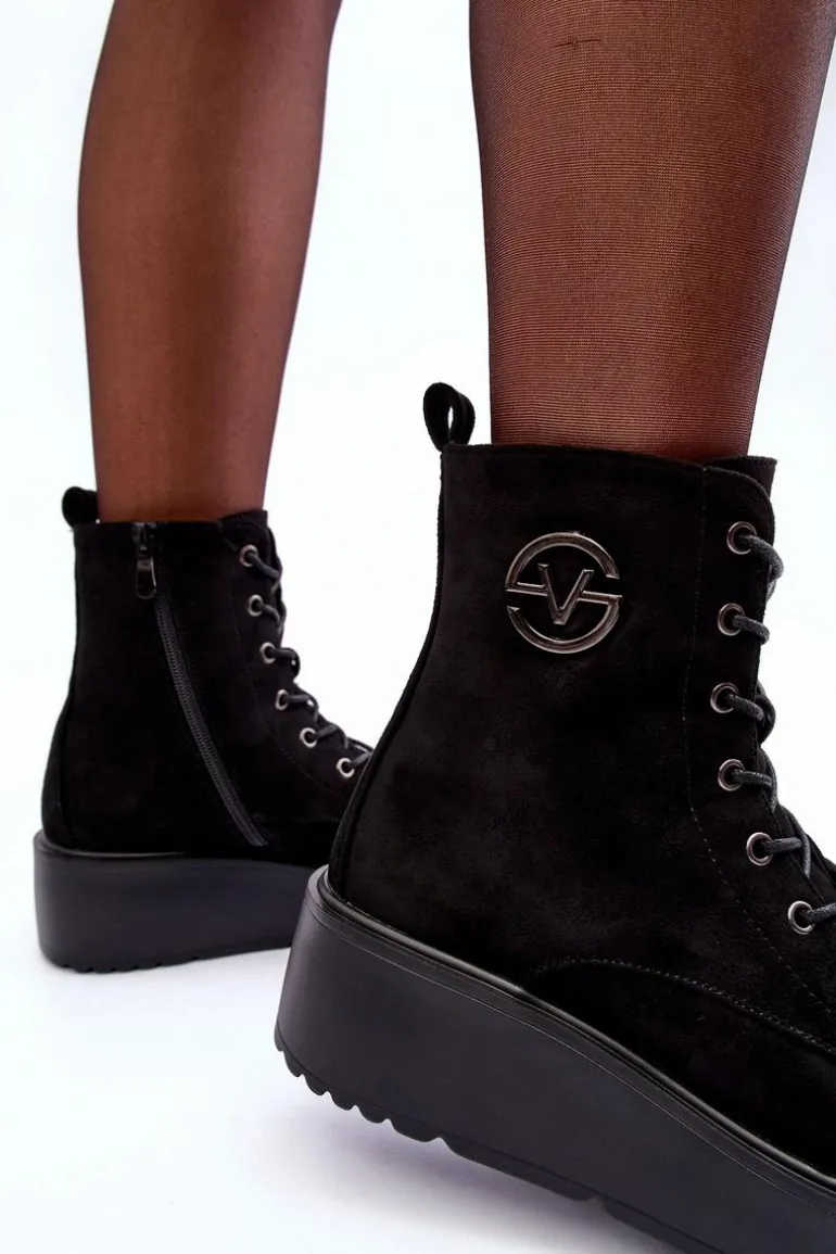 Botki wykonane z eko zamszu. Osadzone na platformie i koturnie. Model zapinany na suwak z boku oraz dodatkowo posiada sznurowanie. Środek ocieplony kocem obuwniczym. Noski zaokrąglone, zapiętek usztywniony. Cholewka z boku posiada ozdobny element. Model ten na pewno sprawdzi się w wielu stylizacjach! Przy wyborze rozmiaru prosimy kierować się tabelą rozmiarów