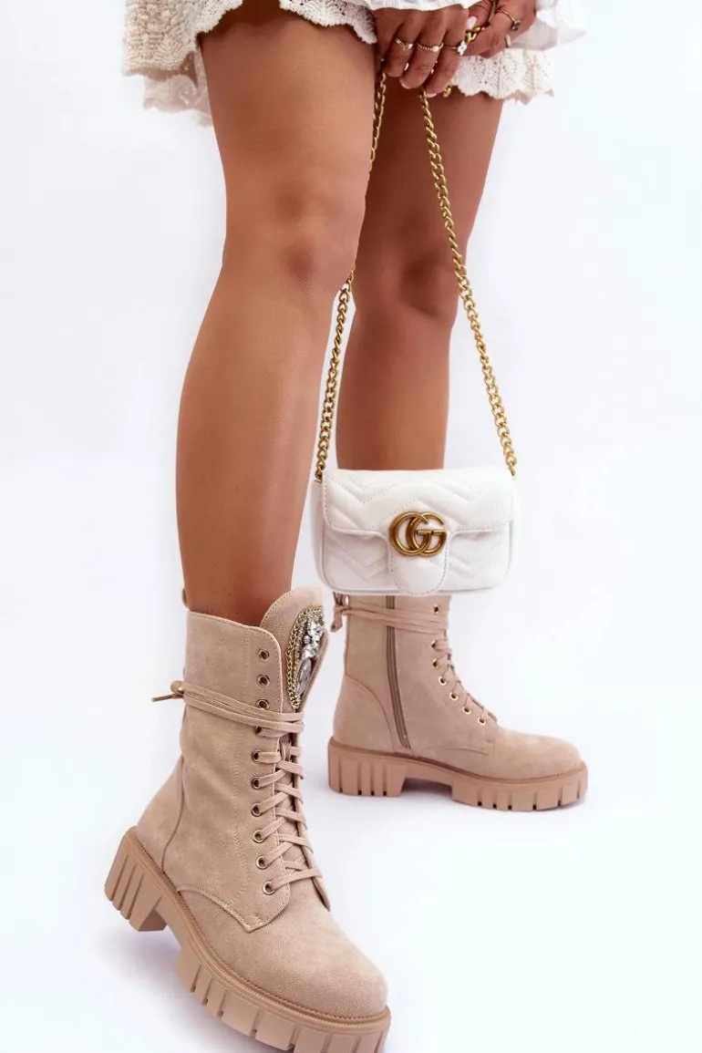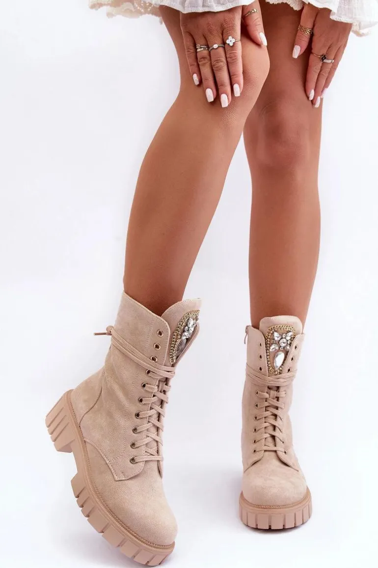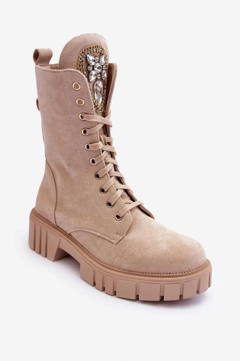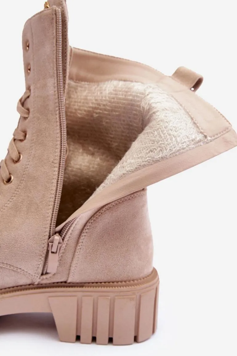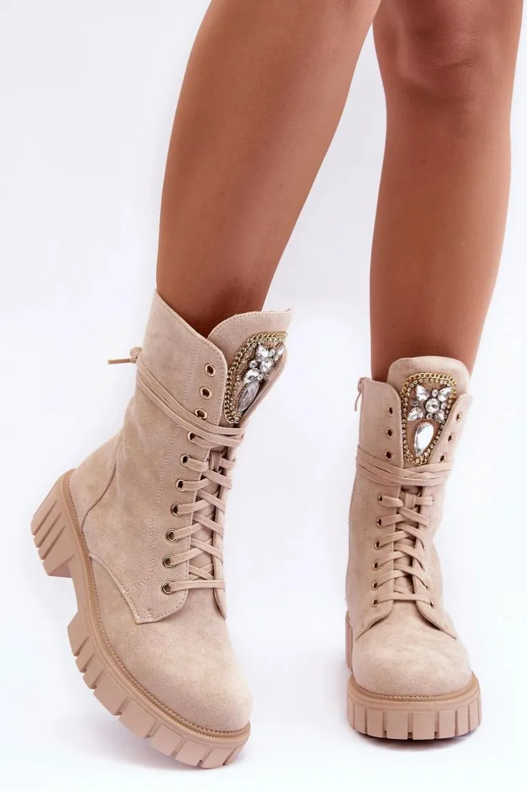 Botki damskie wykonane z eko zamszu i ocieplone kocem obuwniczym. Cholewka za kostkę. Z przodu sznurowanie oraz dodatkowe zapięcie na suwak z boku cholewki. Osadzone na płaskim obcasie i platformie. Na języku biżuteryjna ozdoba. To świetne botki na jesień i zimę! Będą pasować do wielu stylizacji. Przy wyborze rozmiaru prosimy sugerować się tabelą rozmiarów.