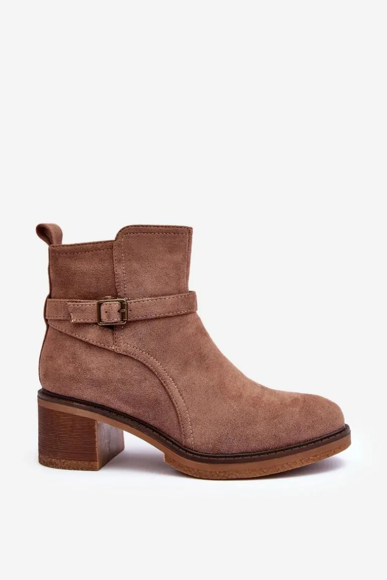 Klasyczne botki wykonane z eko zamszu. Osadzone na obcasie w postaci klocka. Wnętrze ocieplone kocem obuwniczym. Z boku cholewki znajduje się pasek z klamrą. Modny fason sprawia, że możesz założyć je do wielu stylizacji. Nosek zaokrąglony. Buty posiadają także usztywniany zapiętek. W tych botkach jesienne dni nie będą już takie straszne! Przy wyborze rozmiaru prosimy sugerować się tabelą rozmiarów.