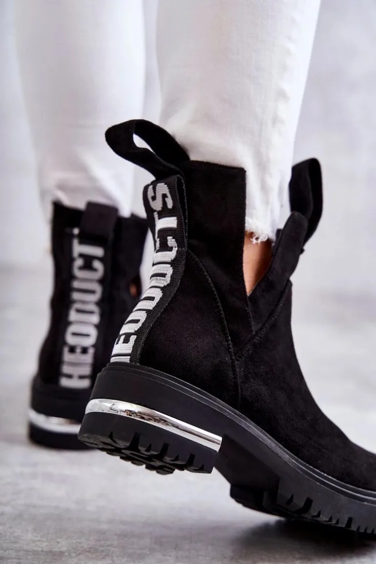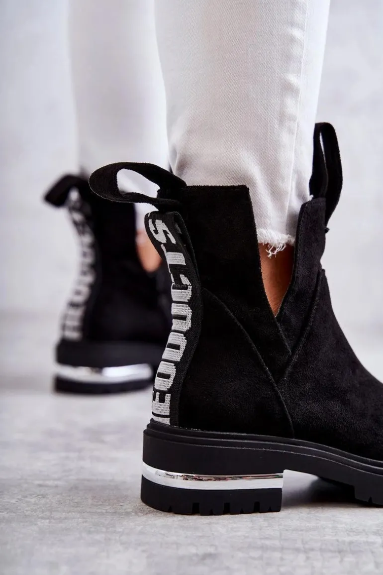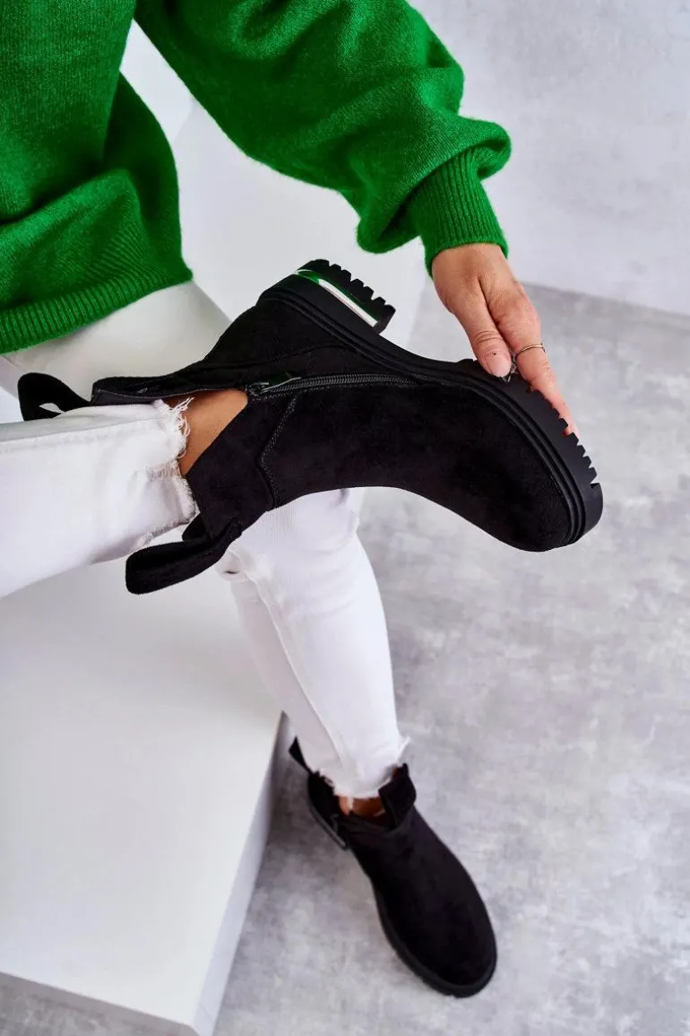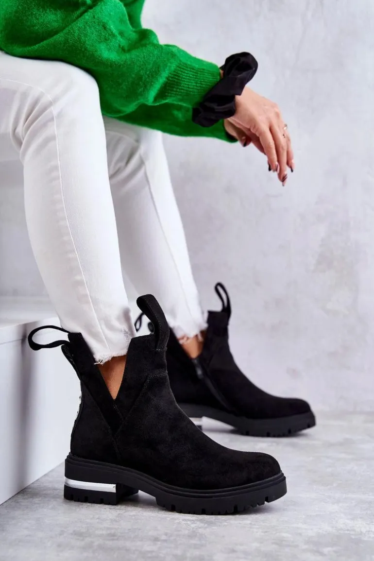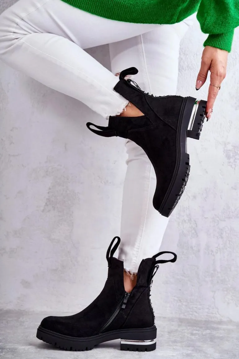 Damskie botki posiadają efektowne wycięcia po bokach cholewki. Z przodu oraz z tyłu posiadają pętelki ułatwiające zakładanie obuwia. Dodatkowo z boku cholewki znajduje się suwak. Botki zostały wykonane z miłego w dotyku eko zamszu. Posiadają usztywniany zapiętek. W środku ocieplone kocem obuwniczym. Osadzone na płaskim obcasie i niewysokiej platformie.Przy wyborze rozmiaru prosimy sugerować się tabelą rozmiarów.