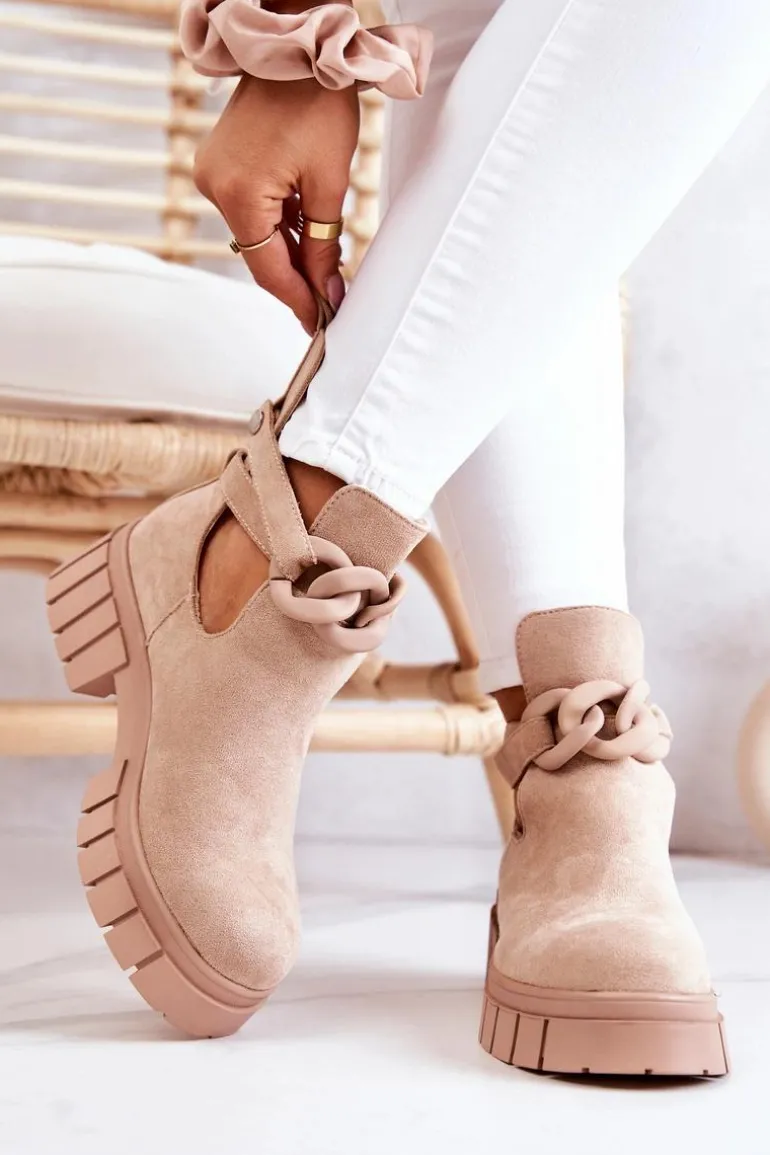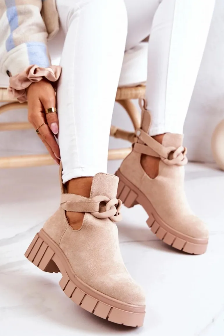 Botki z wycięciem z pewnością podkreślą Twój styl! Wykonane zostały z eko zamszu. Idealne na sezon wiosenno-letni! Model wsuwany. Botki będą pasować do wielu stylizacji. Płaski obcas i masywna podeszwa świetnie będą izolować od zimnego, nierównego podłoża. Pasek z ozdobnym łańcuchem jest zapinany na napę i można go zdjąć. Sprawdź także inne modele botków! Przy wyborze rozmiaru prosimy sugerować się tabelą rozmiarów.
